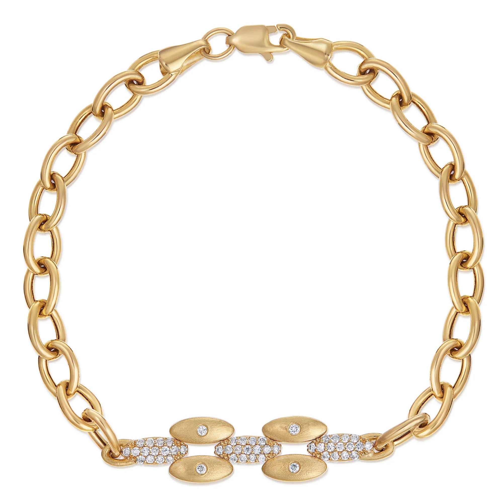 The Mixed Surf Rider Bracelet by Onirikka captures the effortless rhythm of the ocean through its fluid, sculptural design. Crafted in satin 14k yellow gold with a 5 mm fancy rolo chain, it features a diamond-pavé centerpiece that evokes the shimmer of sunlight on gentle waves.