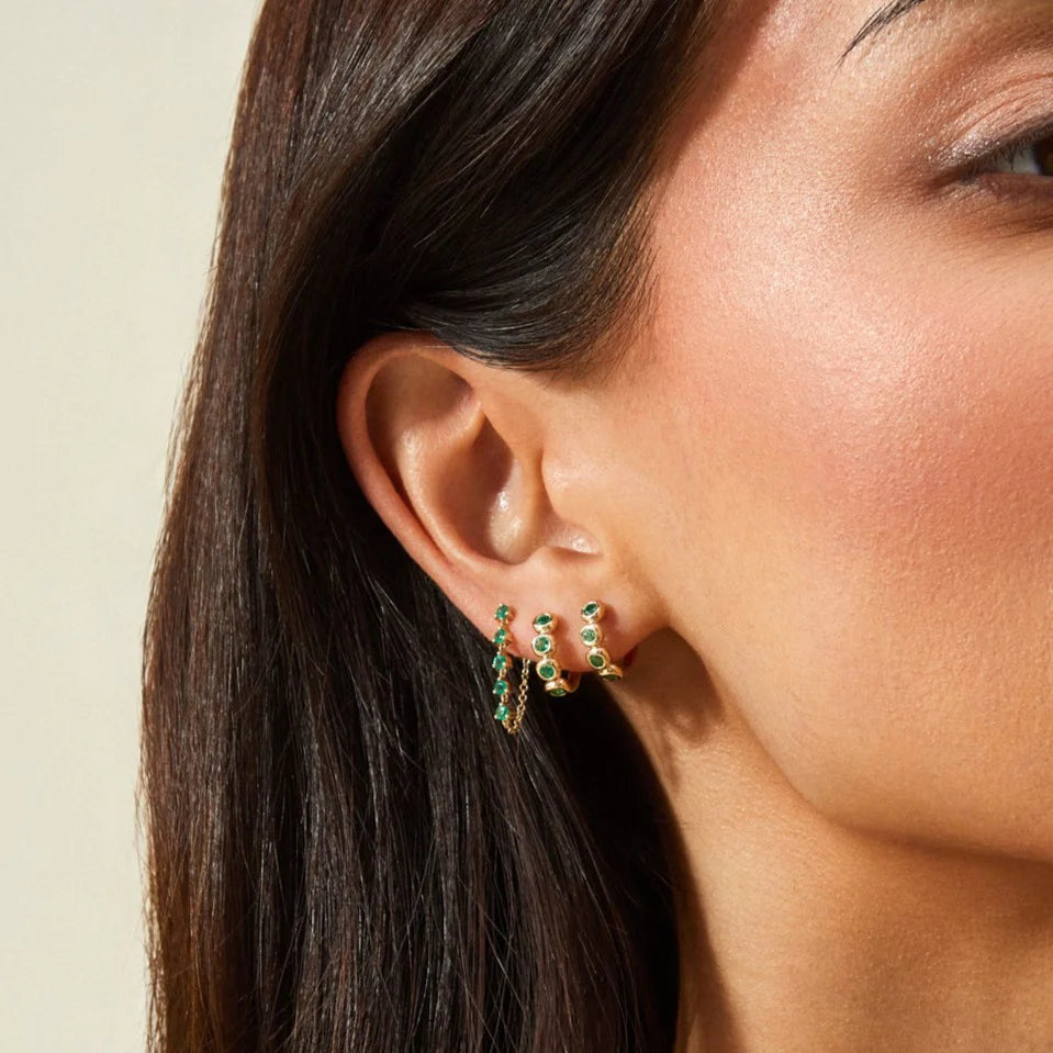 The Multi Emerald Chain Stud Earring adds just the right amount of color. Featuring 5 round emeralds resting along a delicate chain fastening behind the ear, this earring combines the best of a stud and a hoop into one chic style.