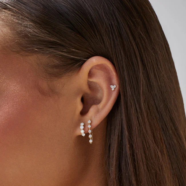 The Multi Diamond Chain Stud Earring dangles with just the right amount of sparkle. Featuring 5 round diamonds resting along a delicate chain fastening behind the ear, this earring combines the best of a stud and a hoop into one chic style. Looking for more like this? Double up on shine. Or treat yourself to a diamond baguette version.