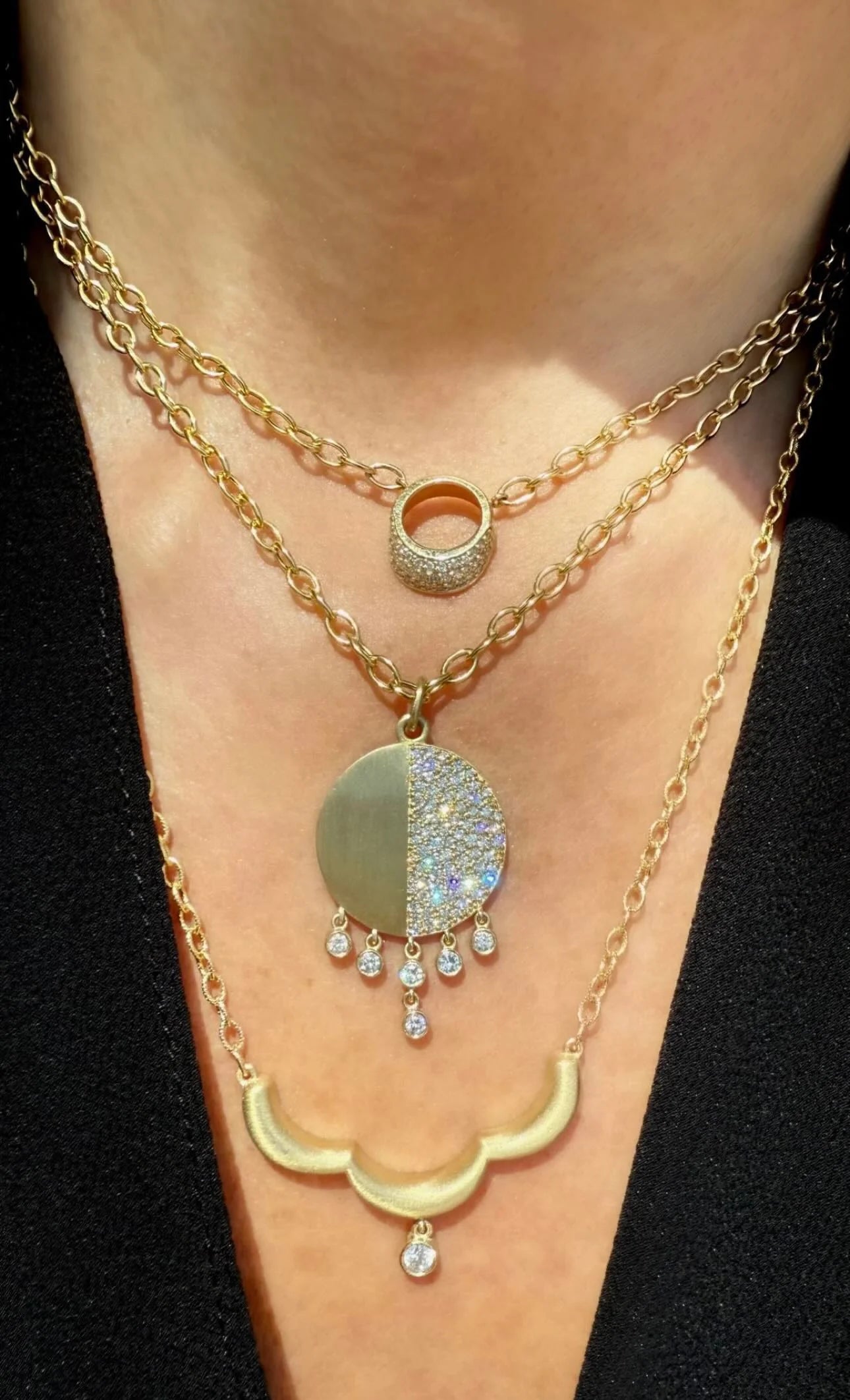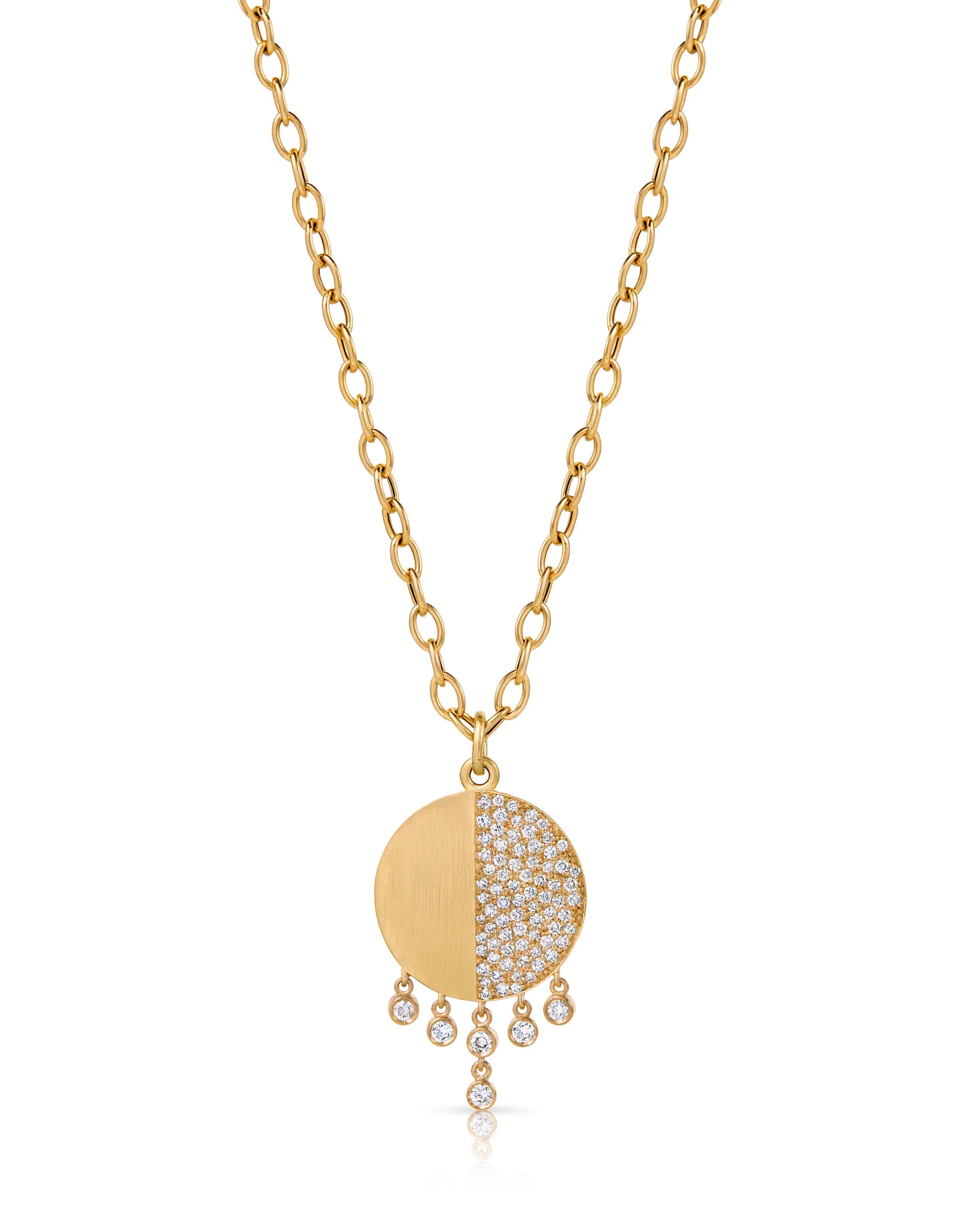 A balance of brilliance and texture, the Mixed Caviar Medallion by Onirikka combines satin-finished 14k yellow gold with a cascading line of pavé diamonds that sparkle like drops of light. Effortlessly elegant, this modern medallion captures the artistry of Onirikka’s design language — sophisticated, fluid, and full of meaning.