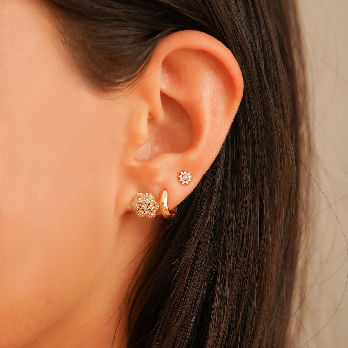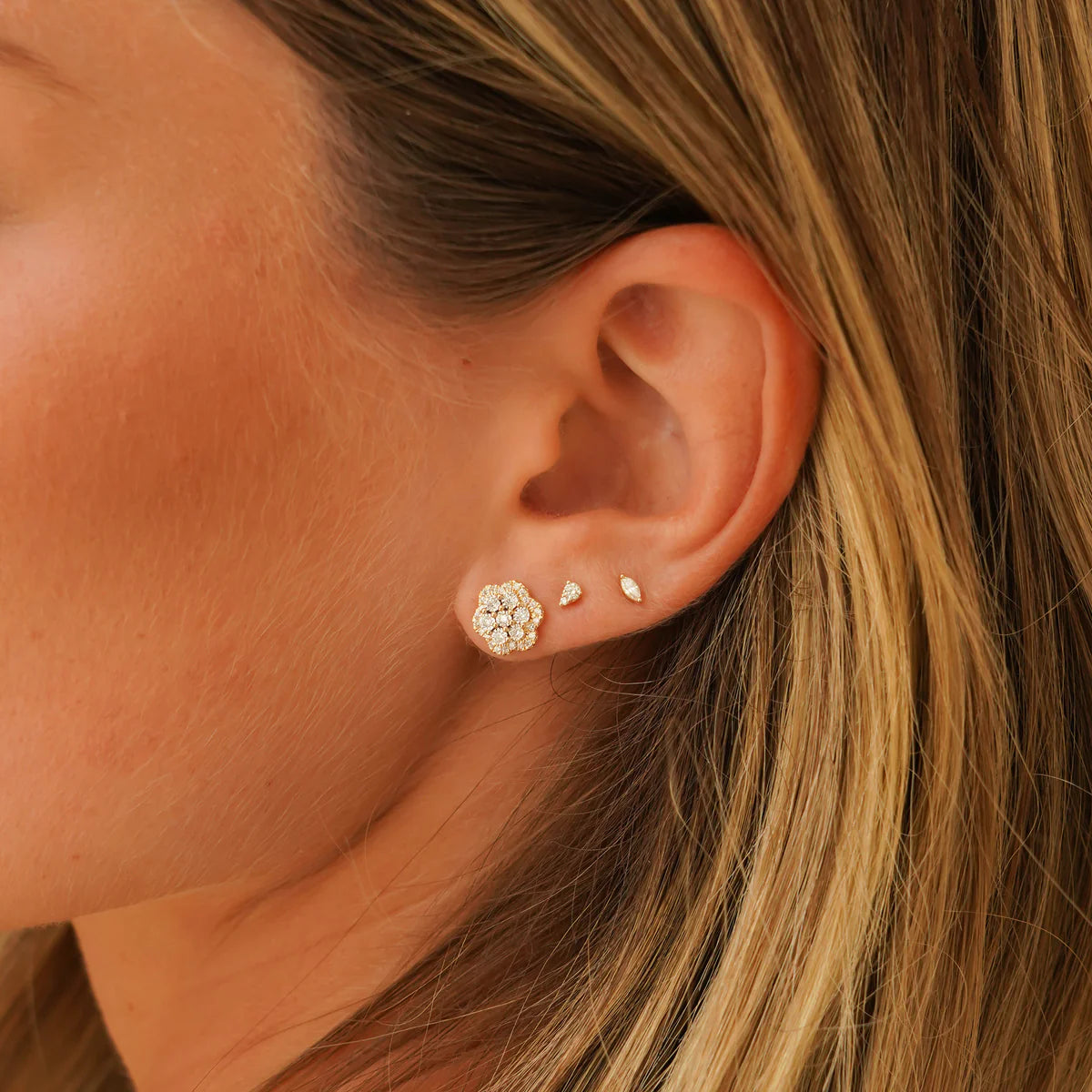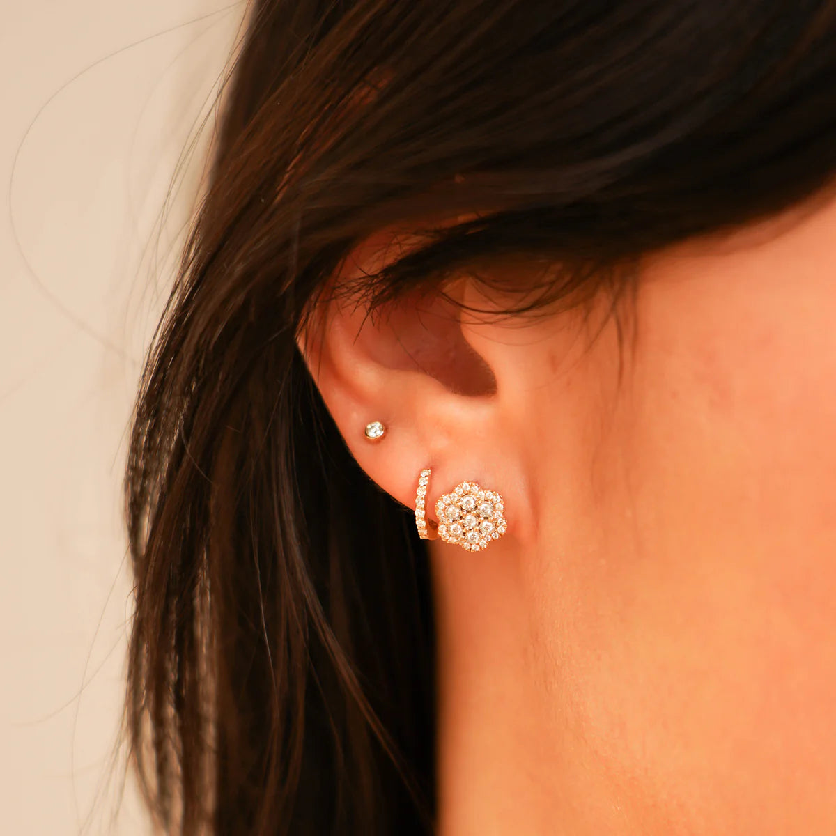 These diamond floral motif stud earrings are nothing short of jaw-dropping. An outer halo of pavé-set diamonds accentuates the inner halo and center diamond, all of which is surrounded with faceted white gold. The mix of faceted gold and brilliant diamonds means near-blinding sparkle. Imagine these large designer stud earrings effortlessly styled from day to night! Whether for a wedding or paired with jeans and a button-down shirt for dinner, they add instant elegance to any ensemble.