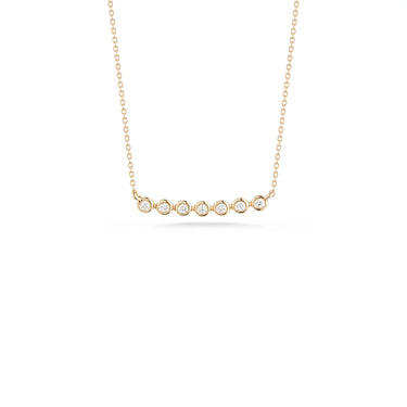 This dainty diamond bar necklace is the perfect everyday staple. Simple and classic on its own, it is also a great layering necklace. This 14 karat gold and diamond bar necklace features white round diamonds bezel set in a row. The bezel settings wrap around each diamond providing not only a modern look but also a protective setting. This piece is a contemporary twist on the classic diamond bar necklace. Our fan-favorite Lulu Jack Bezel Bar Necklace features a delicate cable chain and is available in both 16 inches and 18 inches. This best-selling gold bar necklace comes in two sizes.