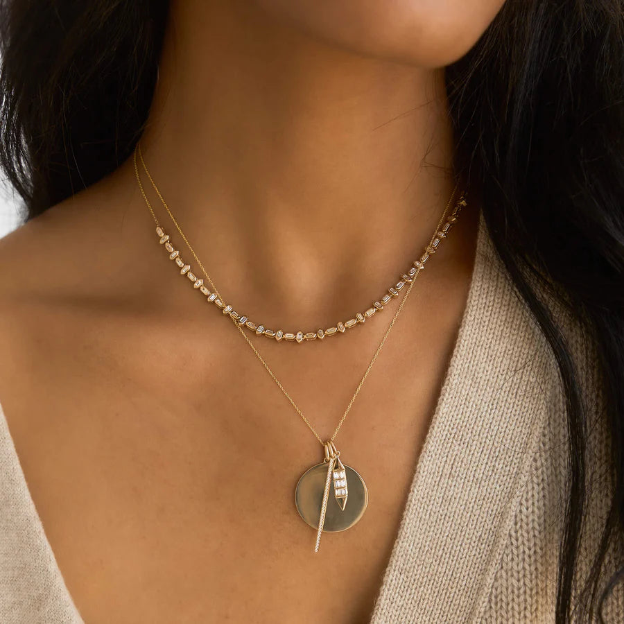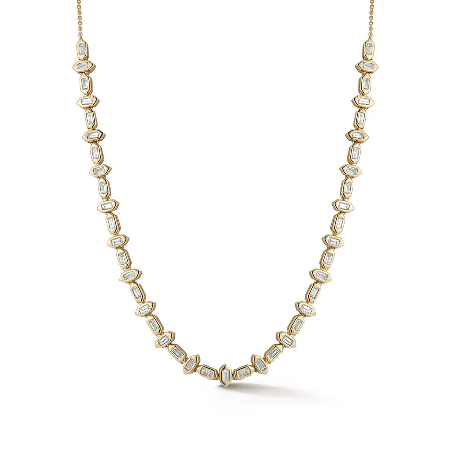 The Sadie Pearl Hexagon Alternating Baguette Tennis Necklace by Dana Rebecca Designs redefines classic luxury with a modern edge. Handcrafted in 14K yellow gold and adorned with 0.94 carats of baguette-cut diamonds, this necklace features a striking hexagon pattern that adds a touch of geometric brilliance to your neckline. Sophisticated and versatile, it layers beautifully or makes a radiant statement on its own—an heirloom-worthy piece made for every day.