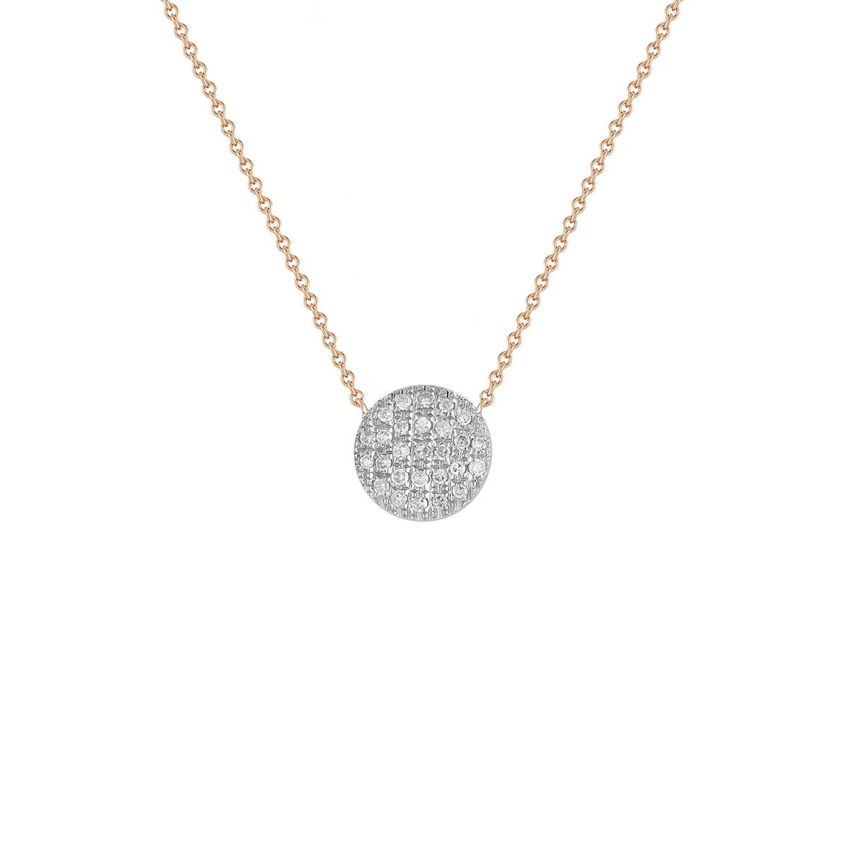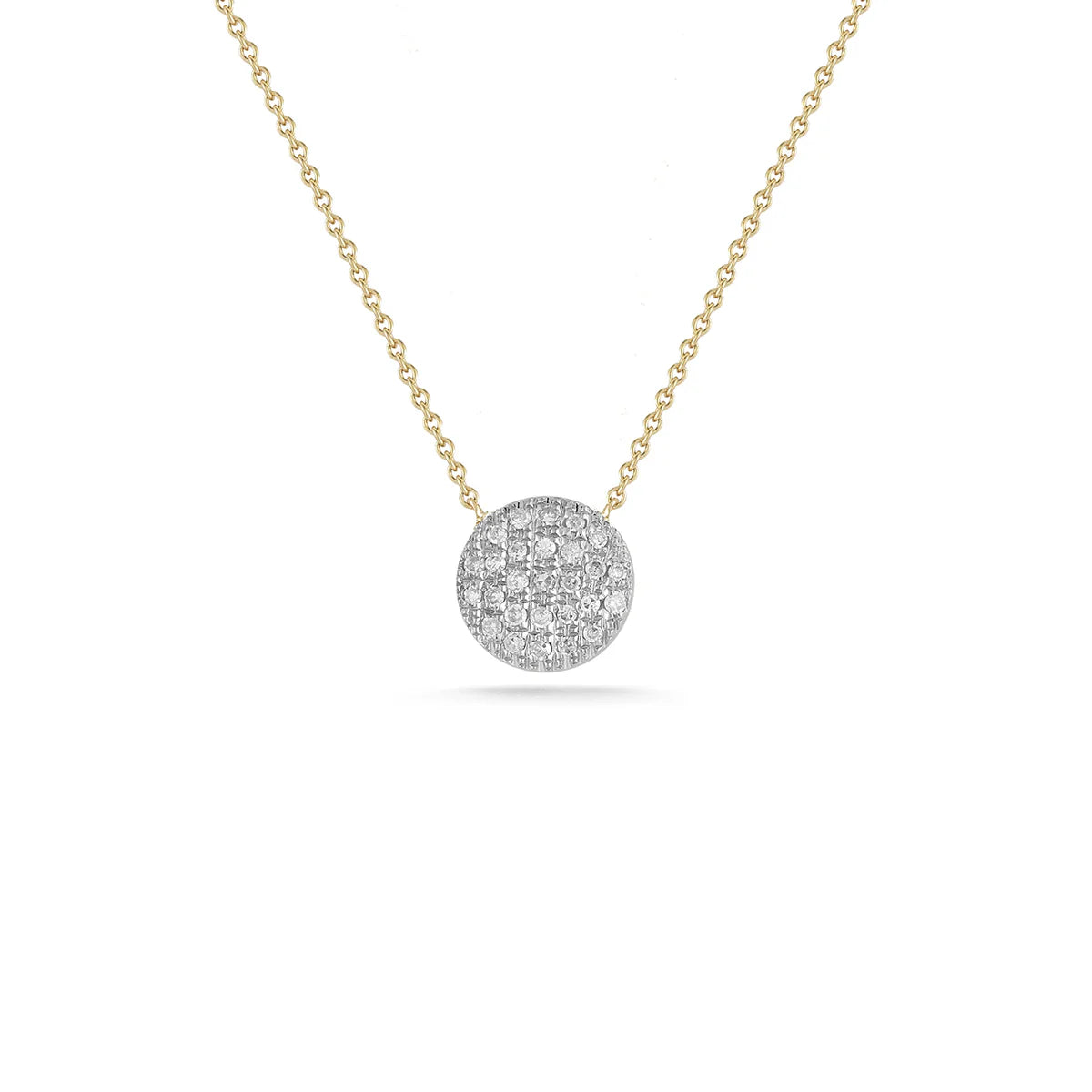 Our best-selling diamond disc necklace is the quintessential every day, goes-with-everything piece. The Lauren Joy Medium disc necklace has pavé-set diamonds and hangs on a delicate cable chain. Great for layering, this necklace will add just enough sparkle to your look. This diamond pendant necklace easily transitions from day to night and looks amazing with anything from loungewear to an evening gown. This 14k gold and diamond disc necklace is available in white, yellow, and rose gold as well as two-tone, and comes in two different chain lengths, 16 inches and 18 inches. Secured with a spring-ring clasp and set with .12ctw of round diamonds.