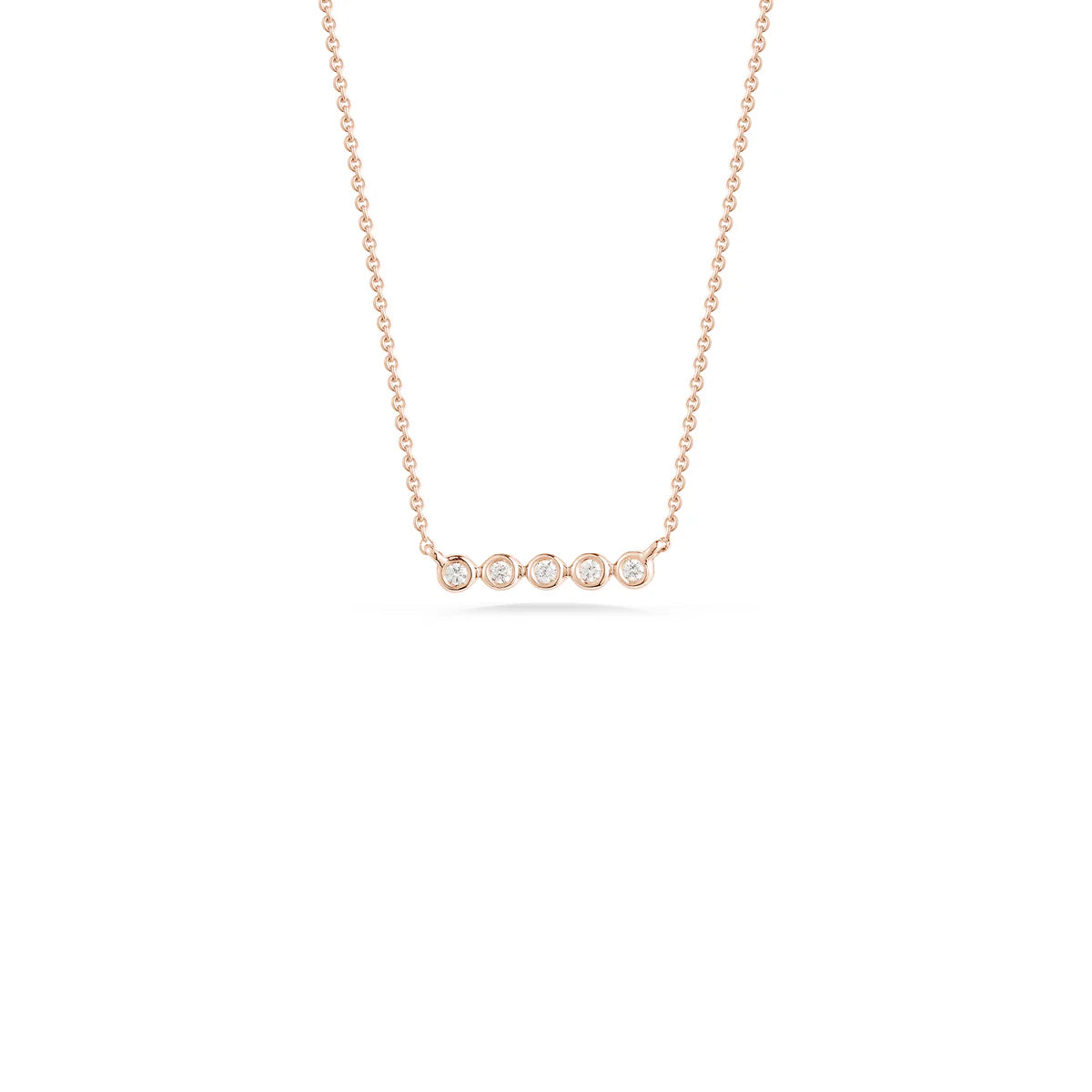 This petite diamond bar necklace is the perfect everyday staple. Simple and classic on its own, it is also a great layering necklace. This dainty 14 karat gold and diamond bar necklace features white round diamonds bezel set in a row. The bezel settings wrap around each diamond providing not only a modern look but also a protective setting. This piece is a contemporary twist on the classic diamond bar necklace. The adjustable chain means this beauty will look perfect with any neckline and makes layering a breeze. If you are looking for something a touch bigger, try our original Lulu Jack Bezel Bar Necklace.