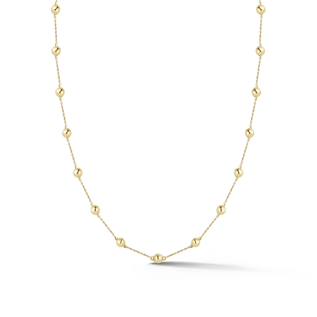 Ever wish you could have a tennis necklace but all gold and no diamonds? Us, too. Gold lovers will delight in the Poppy Rae Eternity Pebble Station Necklace. Made entirely of 14 karat gold pebbles, this station necklace is what is missing from your collection. The comfortable weight of the 14k gold orbs makes this an easy go-to, everyday piece. This timeless style will pair beautifully with the rest of your Dana Rebecca Designs collection. We love to layer it with the Lulu Jack Vertical Bar and Diamond Bezel Necklace. Available in two lengths.