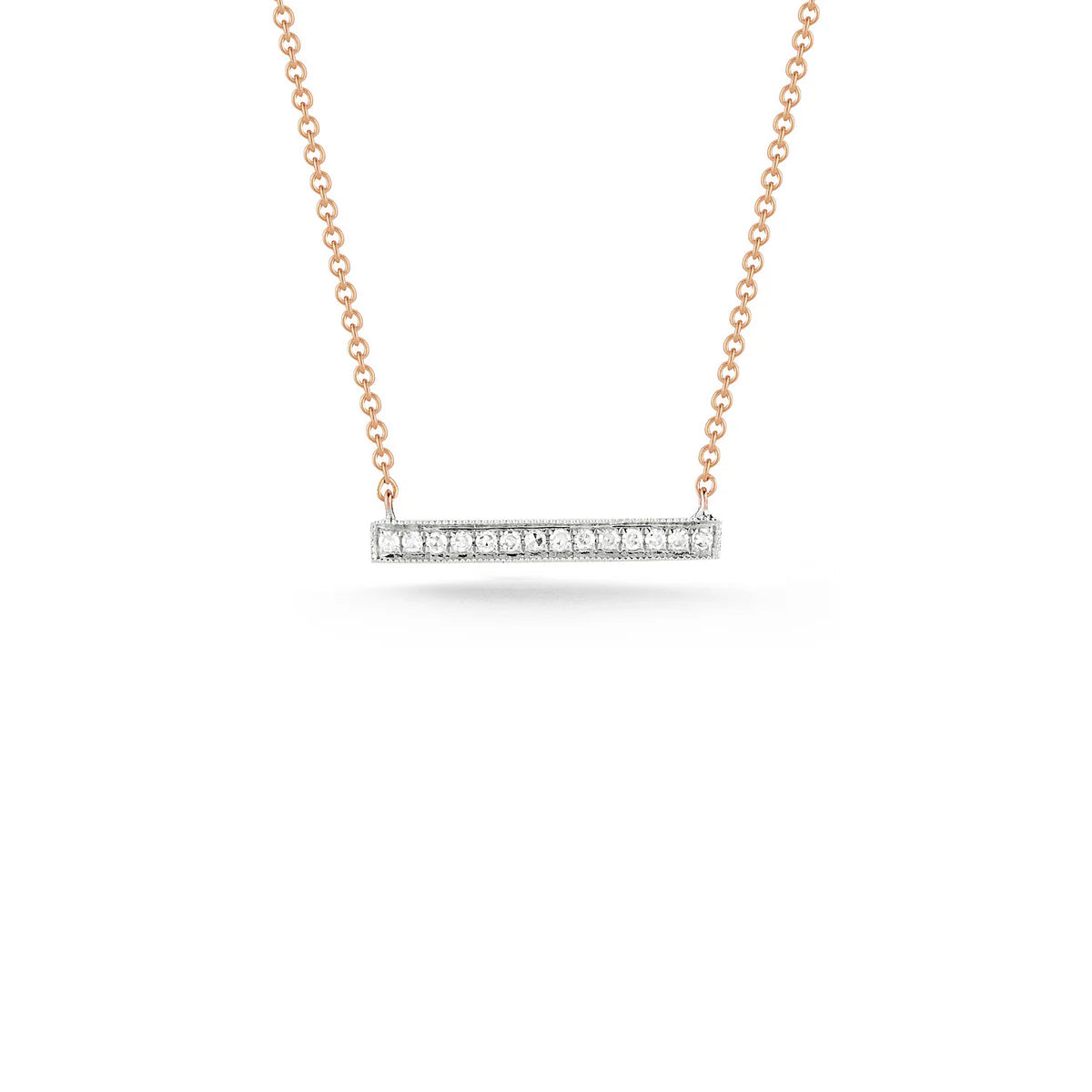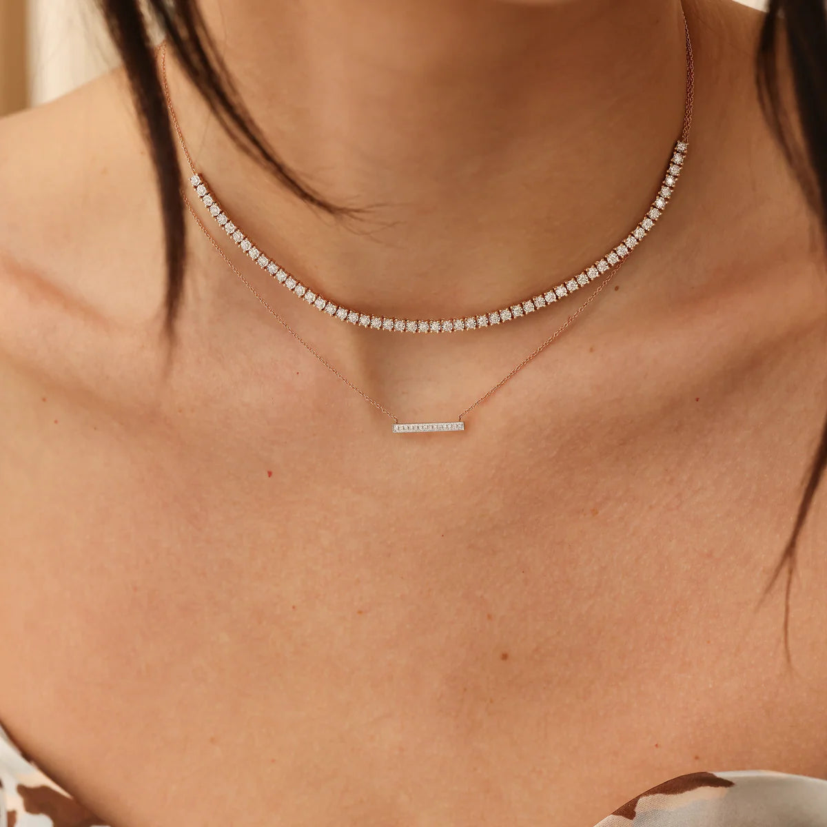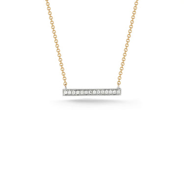 This classic dainty diamond bar necklace is the perfect layering necklace. With delicate pavé set diamonds set into a 14 karat white gold bar, the Sylvie Rose Medium Bar necklace is chic and timeless. No matter if you pick white, yellow, or rose gold, the pendant itself is always white gold so the diamonds pop and appear to float on the bar. Wear it alone for a minimalist jewelry statement or layer it for the ultimate necklace stack. Easily one of our most gifted styles, the Sylvie Rose Medium bar will always delight.