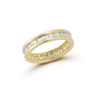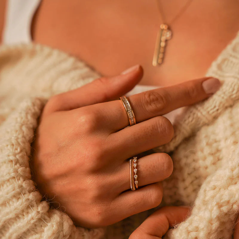 The Sadie Pearl Channel Set Baguette Ring gives old-world, Gatsby-era intrigue. Like any timeless style, this diamond band seamlessly transfers to modern times. Over one carat of brilliant, baguette-cut diamonds are nestled between two 14k gold bands. It's a ring that's bold enough to be worn alone and serves as a dynamite addition to any stack. This diamond ring would be a wonderfully classic addition to wedding day jewelry.