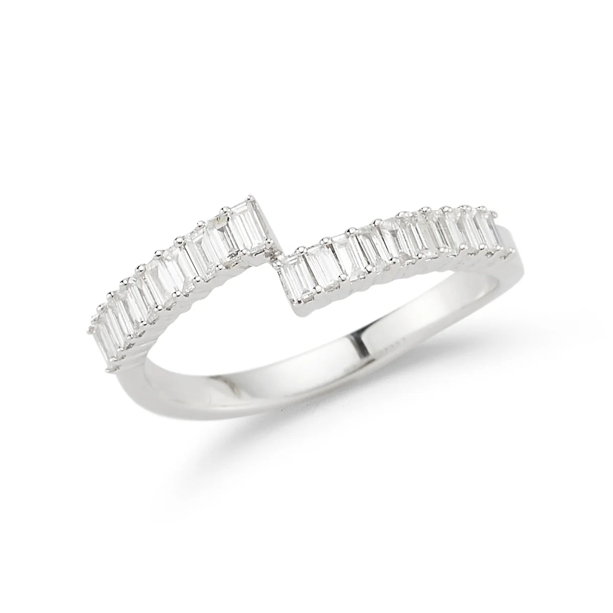 Two of our favorite things, baguettes, and bypass rings, combine to create the Sadie Pearl Split Baguette Ring. Shimmering baguette diamonds set vertically give this modern ring a dynamic sparkle. The signature open style will add a little edge to your everyday ring stack. This is a great statement ring to rock solo but it still pairs beautifully with the rest of your Dana Rebecca Designs collection.