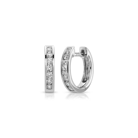 The perfect daily diamond huggies. Featuring channel-set round diamonds, these huggies deliver timeless sparkle solo or stacked.