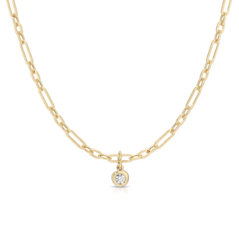 A mini gold chain combines round and elongated links for a dimensional look that complements the necklace’s pillow-set diamond drop. This piece strikes the perfect balance between delicate and bold, making it a versatile style to be worn solo or layered.