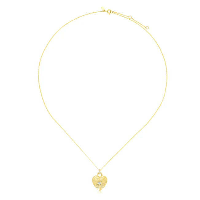 The Gold & Diamond Fluted Heart Necklace is a true charmer. With a central diamond set inside a gold sparkle design, this heart-shaped pendant features fluted lines that beautifully reflect light for added dimension and depth. Finished with a diamond-encrusted bail, this necklace is all about sparkle.