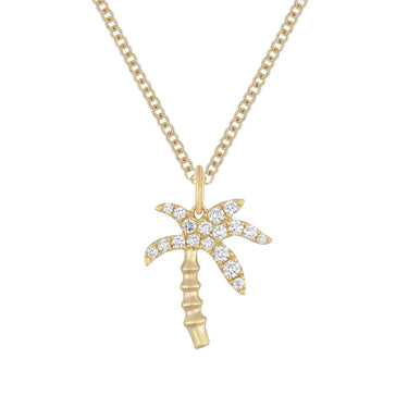 This palm tree necklace features pavé diamond palm leaves and a gold dimensional trunk.