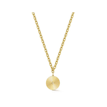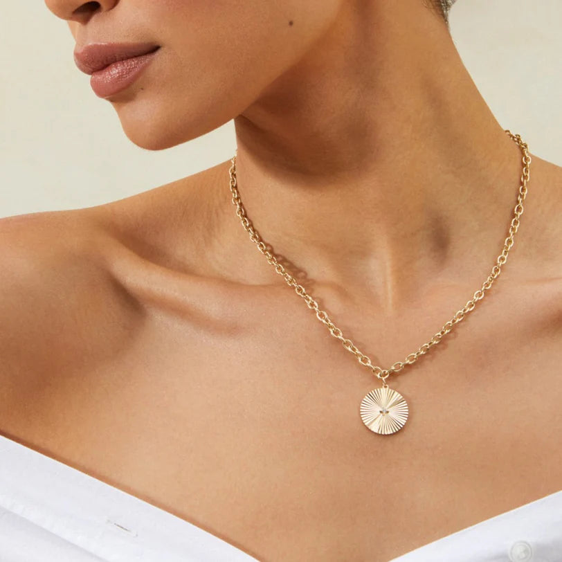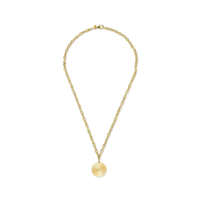 The Jumbo Gold & Diamond Fluted Disc Chain Necklace makes an impression. Resting on a smaller version of our Sienna Chain, the pendant features a central diamond set inside a gold sparkle design surrounded by fluted lines that beautifully reflect light for added dimension and depth.
