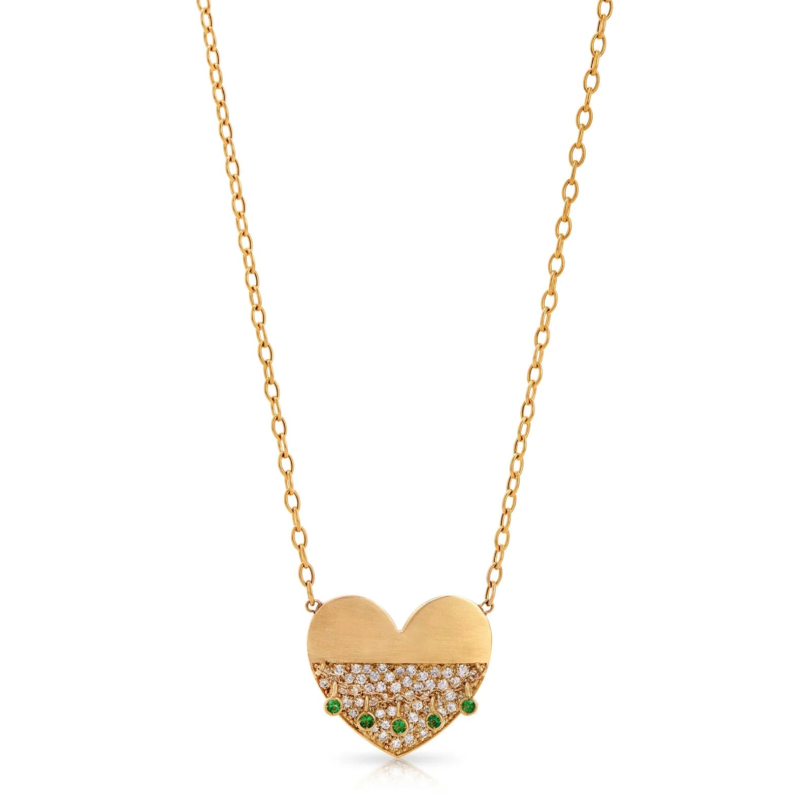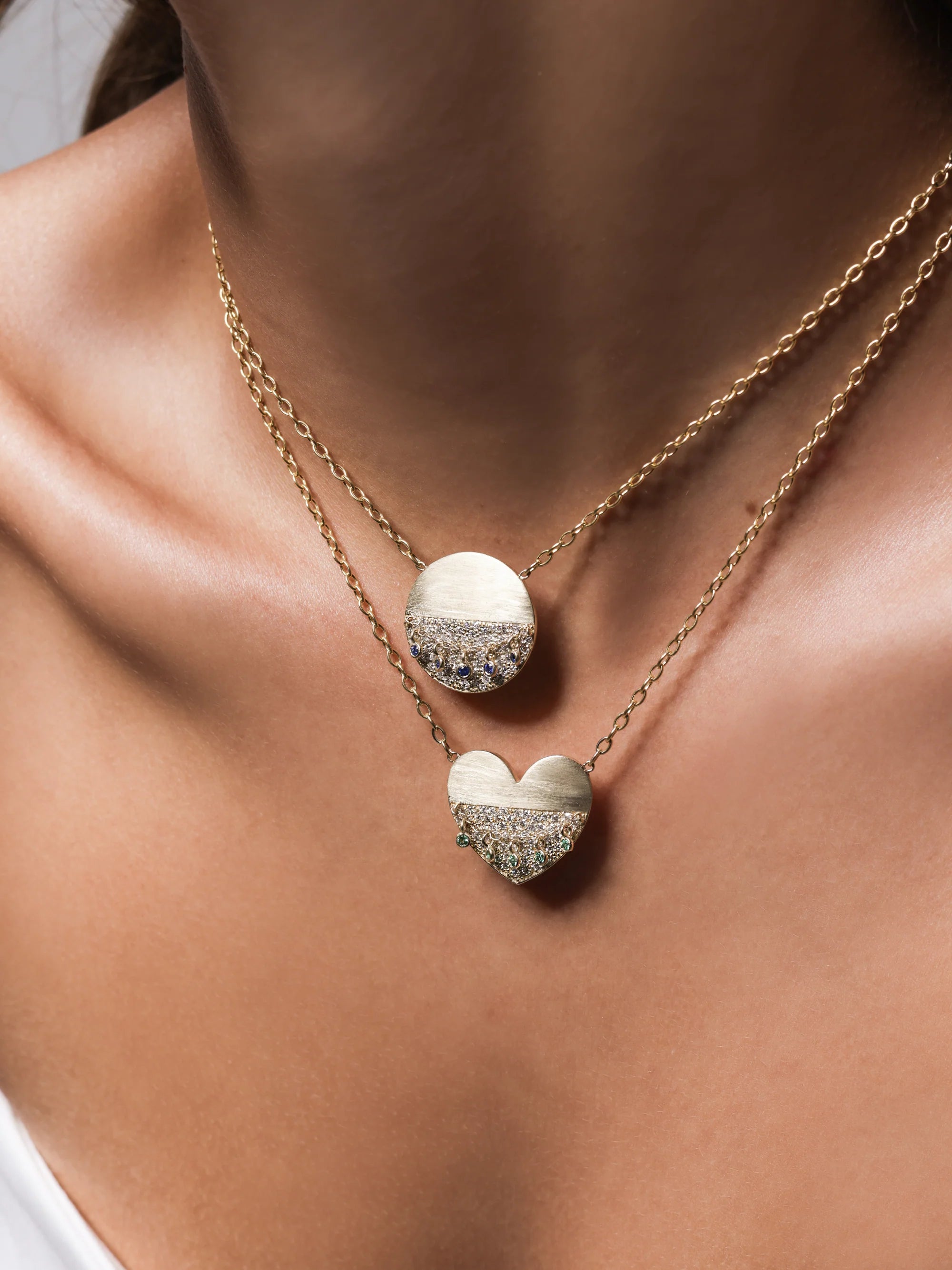 The Heart Hemline Medallion by Onirikka symbolizes progress, resilience, and love in motion. Crafted in satin 14k yellow gold, this pendant features 0.53 carats of brilliant diamonds and 0.07 carats of vibrant emeralds, set along a delicate 2.2mm 18-inch fancy rolo chain.