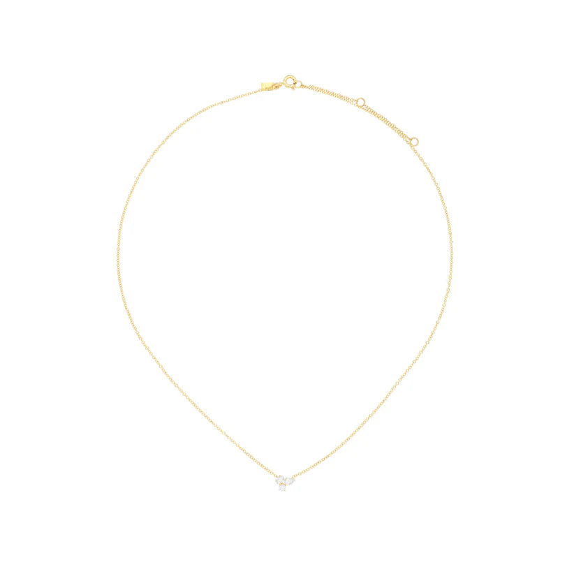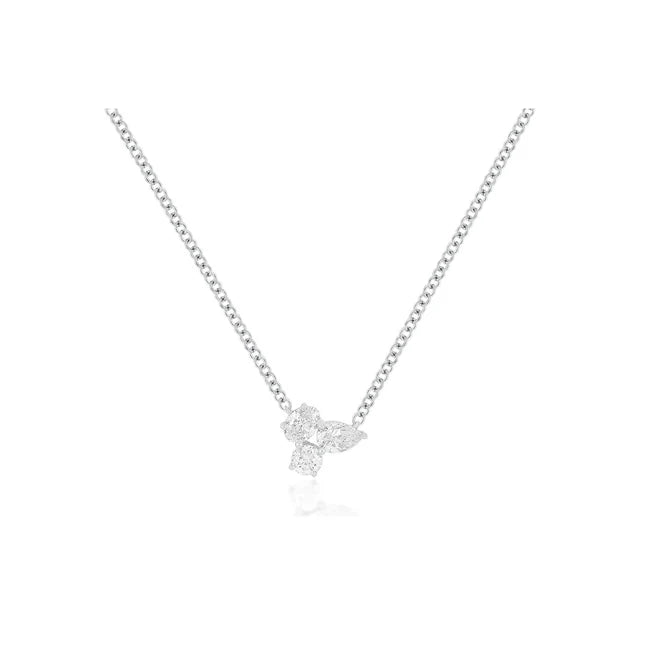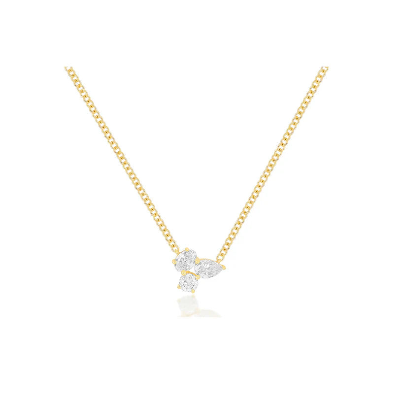 The Triple Diamond Cluster Necklace features a cluster of pear, round, and oval diamonds set on a dainty chain. Designed to make a sparkling statement, this modern style adds serious shine.