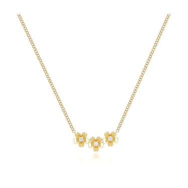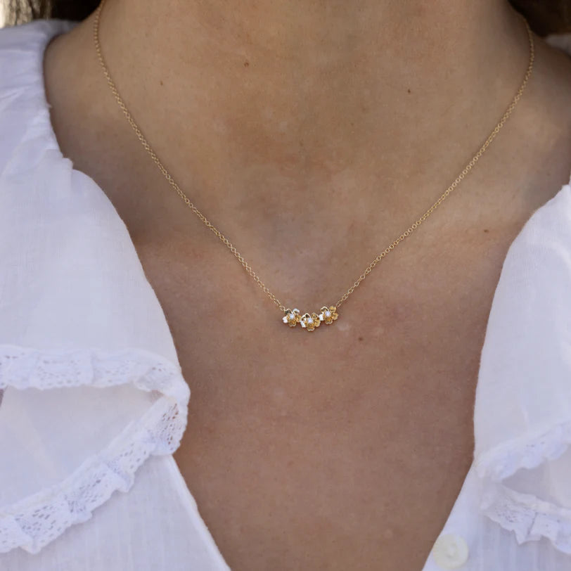 The Triple Gold and Diamond Mini Cherry Blossom Necklace is a true floral treasure. This sweet style blooms with a trio of dimensional gold flowers, each with a central round diamond, set on our signature dainty chain. Known to symbolize renewal, cherry blossoms are one of our favorite ways to celebrate new beginnings.