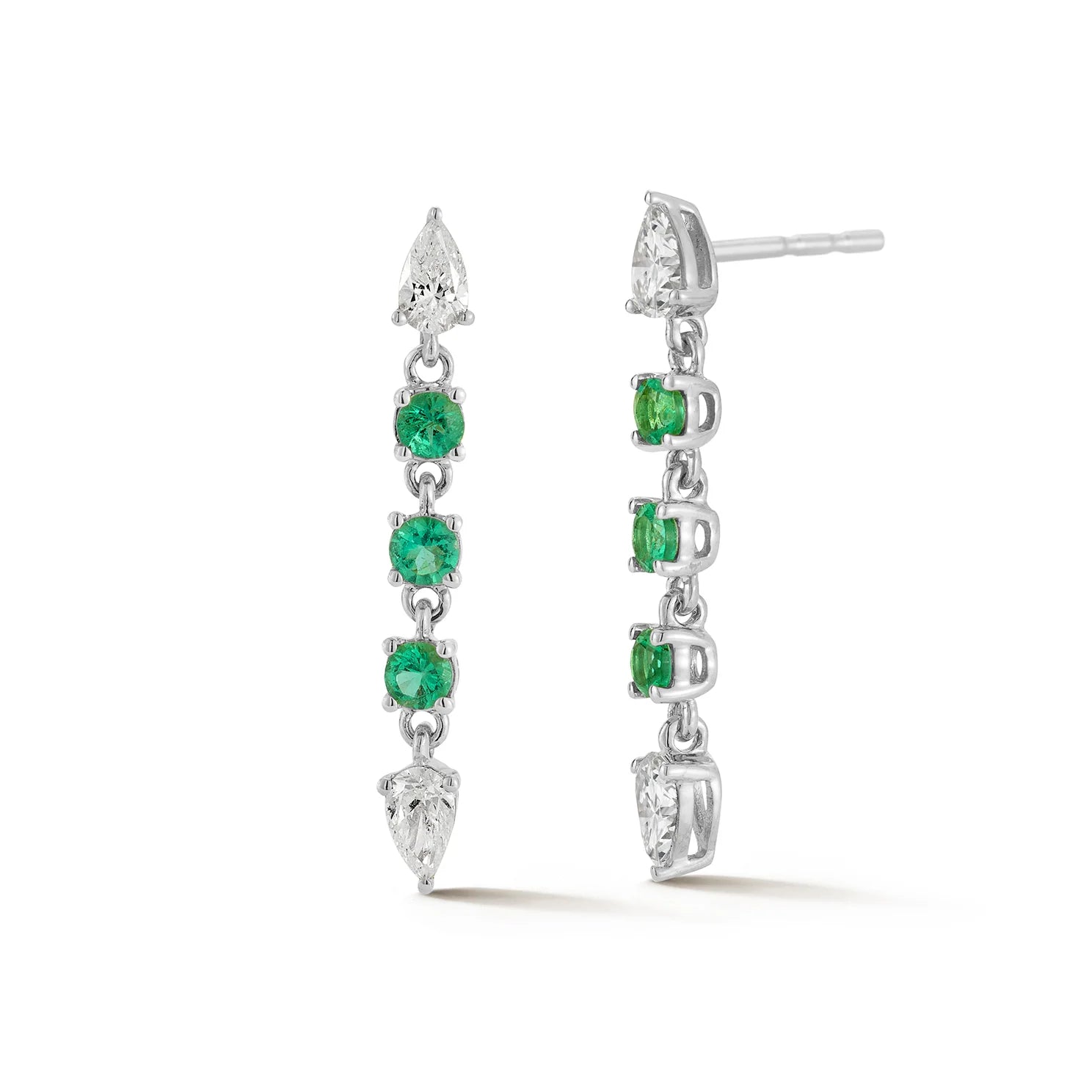 The Diamond & Emerald Drop Stud Earrings twinkle with a festive combination of white, green, and gold. Designed with two pear stones at either end and three central round emeralds, these elegant earrings work for daily wear or an evening out.