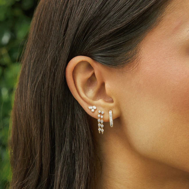 The Triple Diamond Cluster Stud Earrings feature a cluster of pear, round, and oval diamonds. Designed to make a sparkling statement, these modern studs rock.