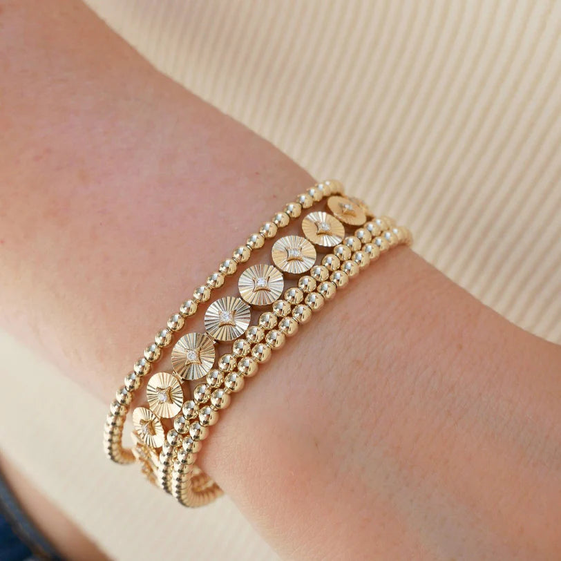 The Gold & Diamond Fluted Disc Eternity Bracelet encircles your wrist with shine. Each disc features a central diamond set inside a gold sparkle design with fluted lines that beautifully reflect light for added dimension and depth. Finished with a comfortable and secure box clasp, this bracelet is sure to become a cherished heirloom.