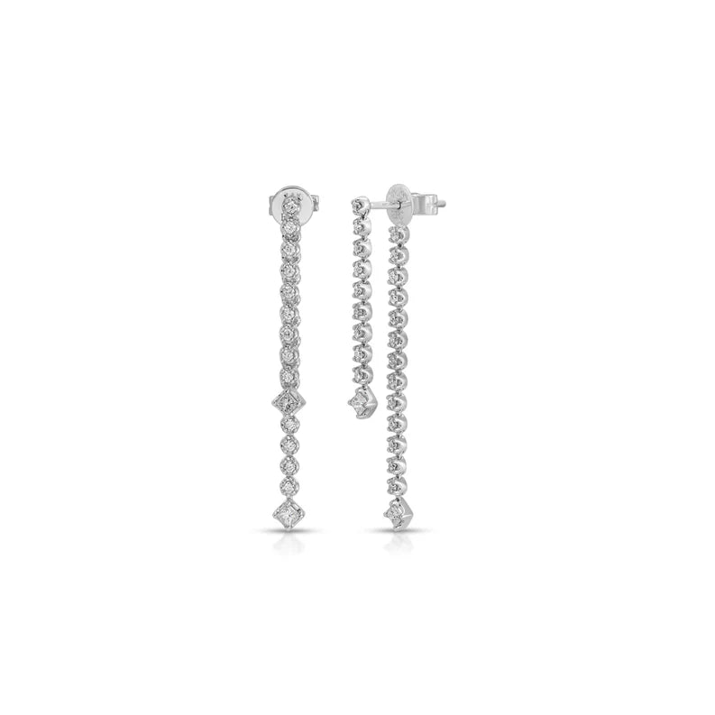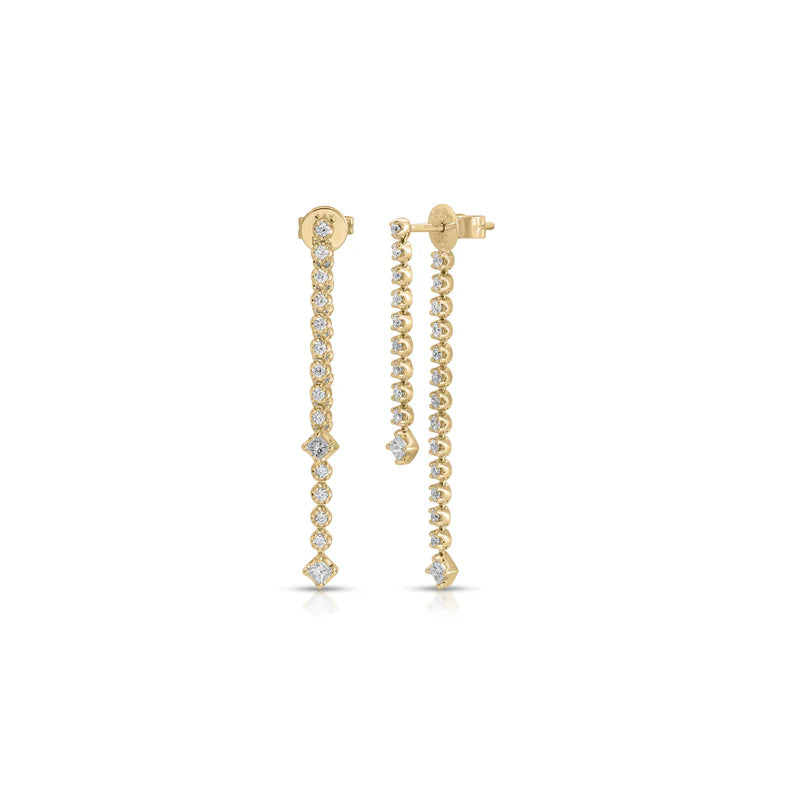 These statement drop earrings feature crown-set diamonds that cascade from the front and back of the lobe. Finished with princess cut diamonds set at it's points, this unique earring was thoughtfully crafted for fluid movement and ensures captivating sparkle from every angle.