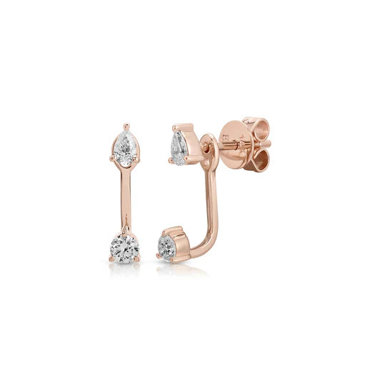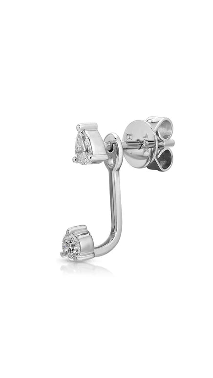 This illusion earring features pear-cut and round diamonds, with the pear-cut stone as the stud and the round diamond positioned just below the lobe to create a “floating” effect. A curved gold bar extends from the back of the stud to connect both stones for a sleek and eye-catching silhouette. This earring is adjustable with two size options to fit most lobes.