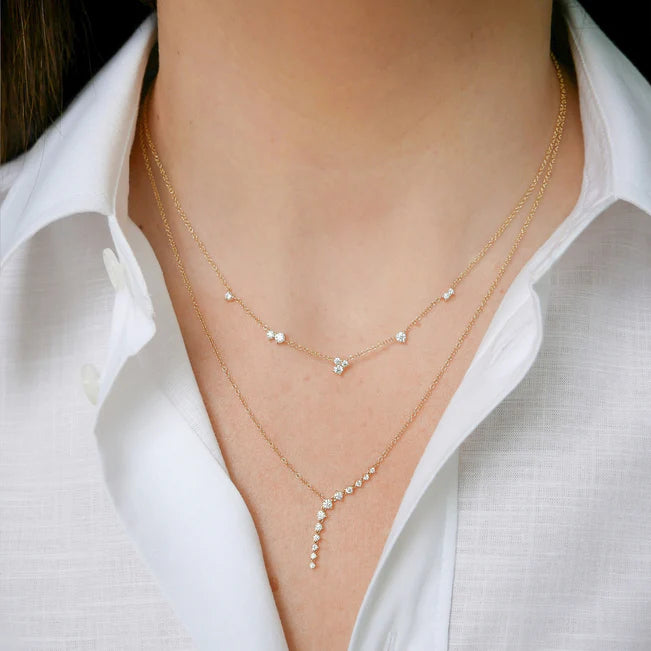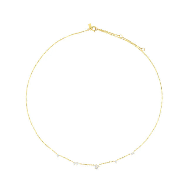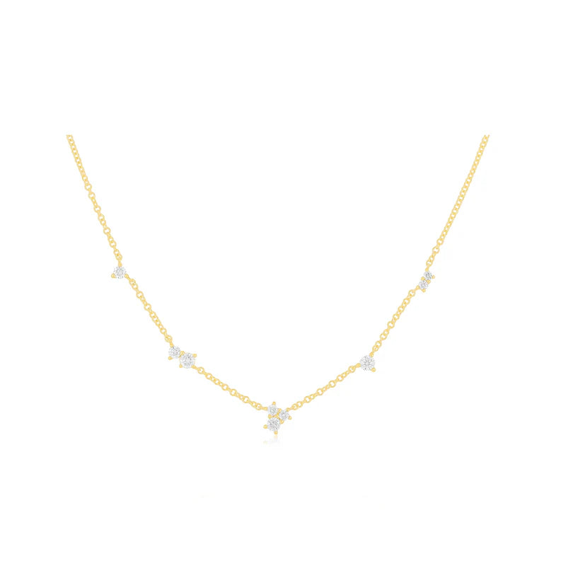 The Multi Diamond Cluster Necklace is like wearing a constellation around your neck. Featuring five unique clusters of asymmetric prong-set diamonds, this dainty style adds a twinkle to any look.