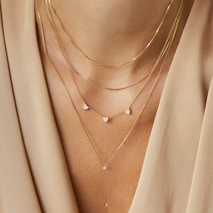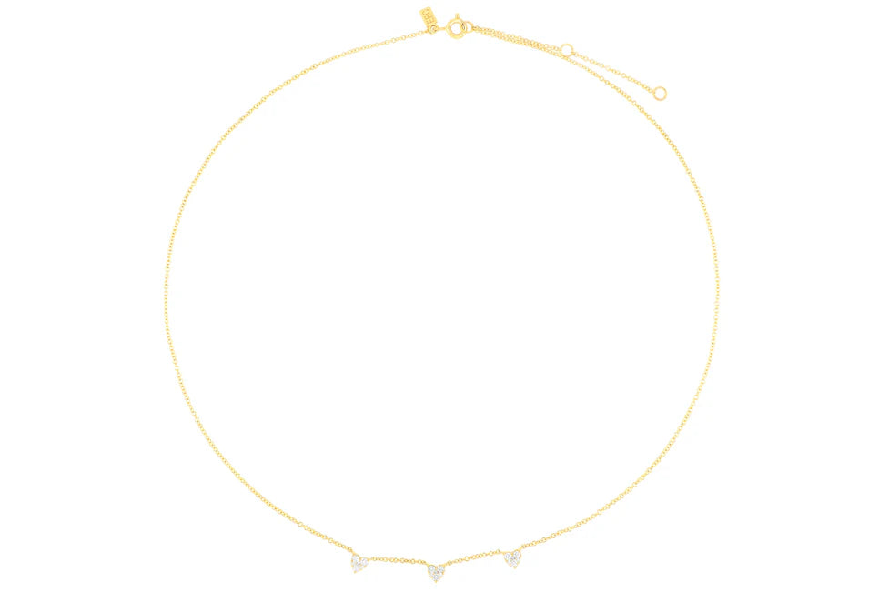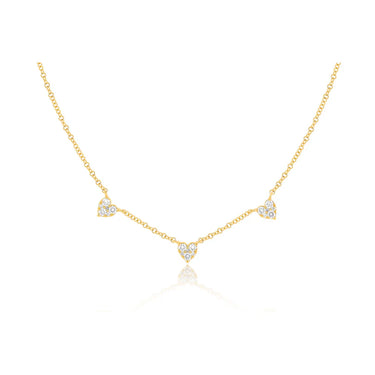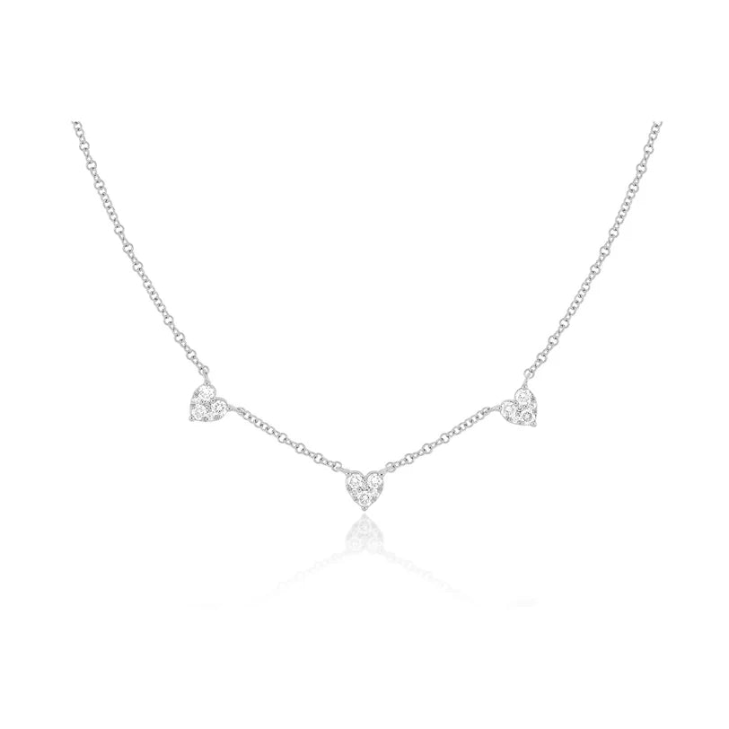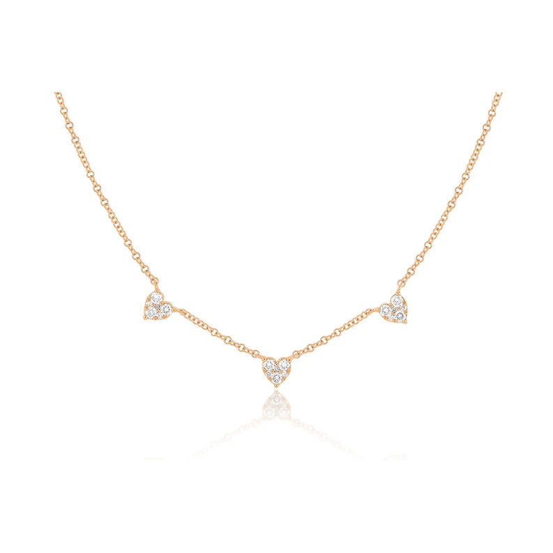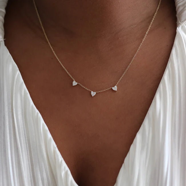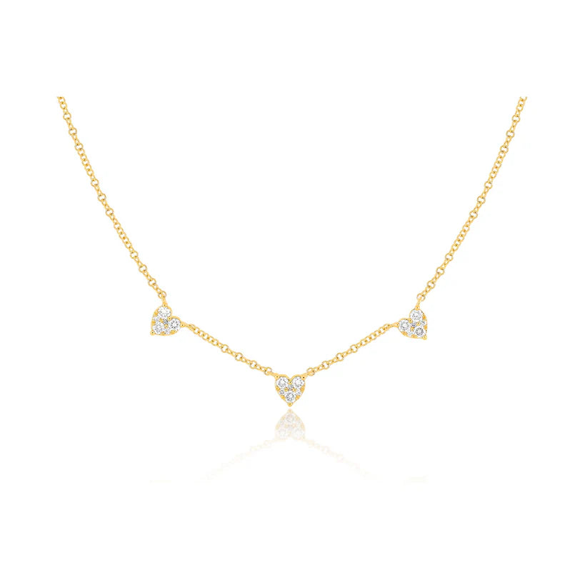 The Triple Full Cut Diamond Heart Necklace features a trio of pavé hearts resting along a dainty chain. Made with .24 carats of diamonds, this necklace is sure to bring the love.