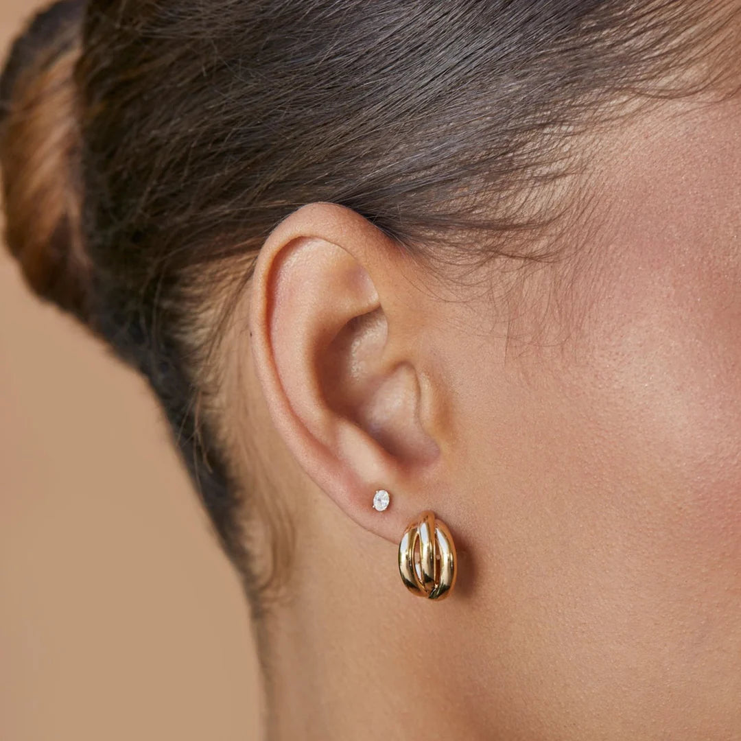 The Gold Knot Huggie Earrings bring a whole new meaning to layers. Designed with overlapping hoops creating a knotted look, this hollow 14k gold huggie elevates your look without weighing you down.