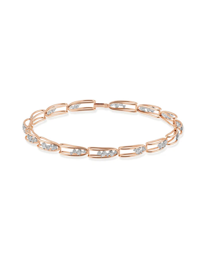 Our Mara Folded Links Choker is made in 18K gold with varying sized round, pear and oval shaped natural diamonds set in platinum. Featuring asymmetrical diamond filled links.