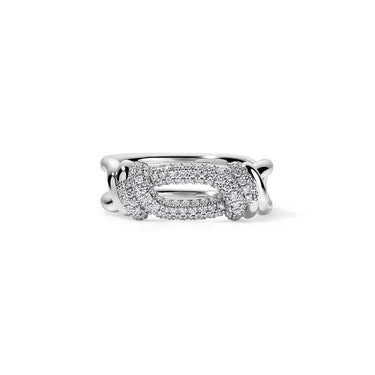 Our popular asymmetrical link in ring form. Twisting brilliance is covered in 3-rows of pave round brilliant natural diamonds.