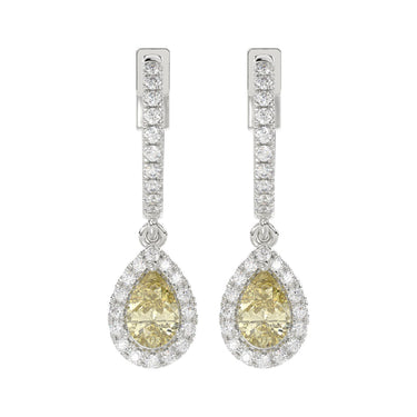 14K WHITE GOLD CRAFTED WITH 18K YELLOW GOLD BACK PLATE 1 1/2CT ROUND/YELLOW PEAR DIAMOND LADIES EARRINGS