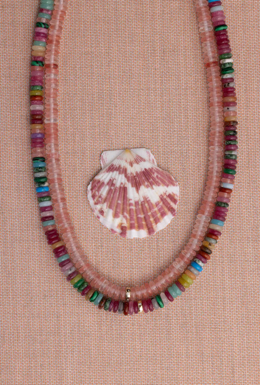 Radiant in the rainbow. Make a bold statement with our rondelle bead necklace. Hand-strung with multi-colored beads and finished with a luminous 14k gold and diamond rondelle, this necklace brings the prettiest pop of color, a joyful mix to energize your daily necklace layer.