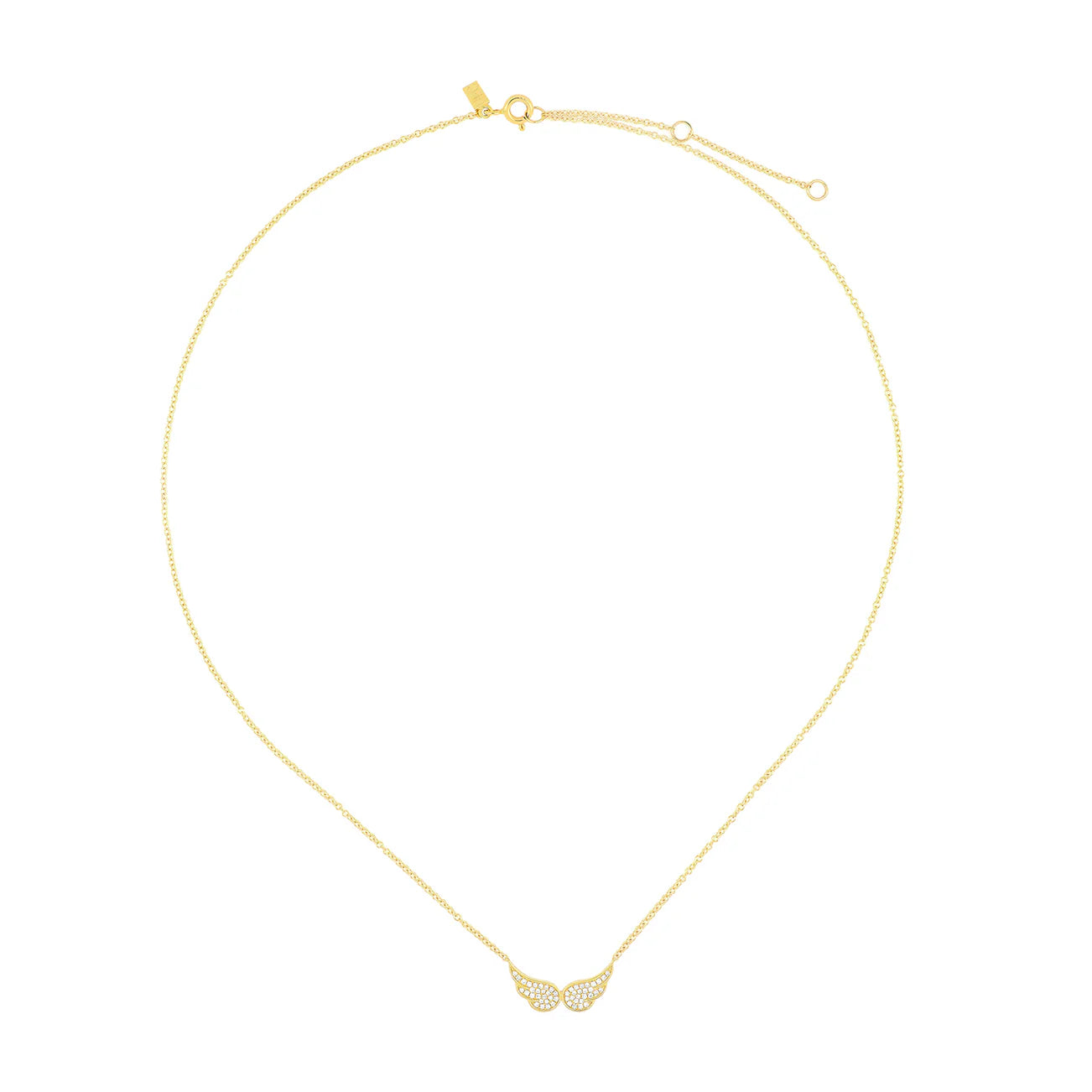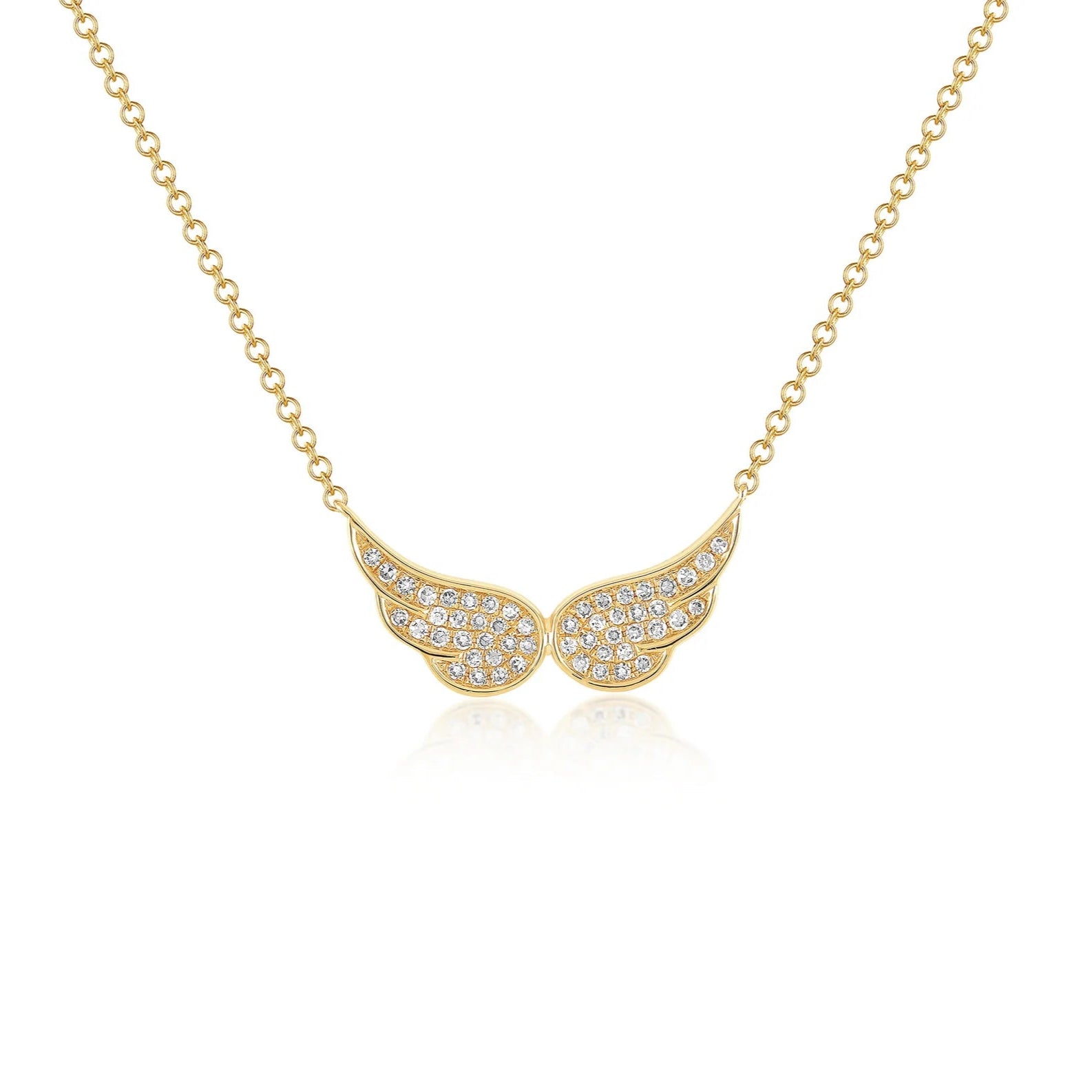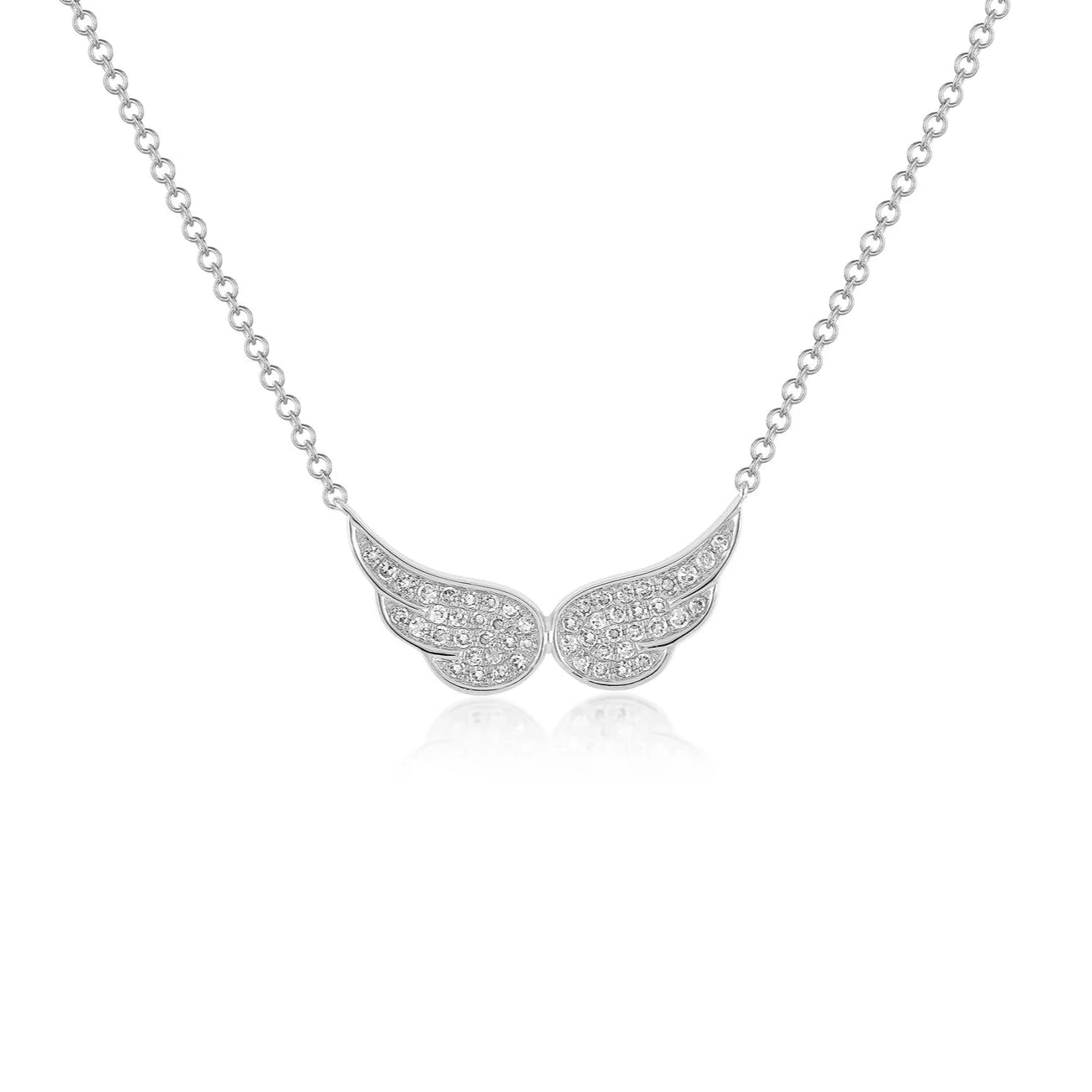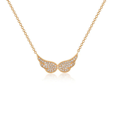 The Diamond Double Angel Wing Necklace is one of our most meaningful motifs. Featuring two angel wings encrusted with .12 carats of pavé diamonds, this special piece was designed to provide comfort and love to anyone wearing it.
