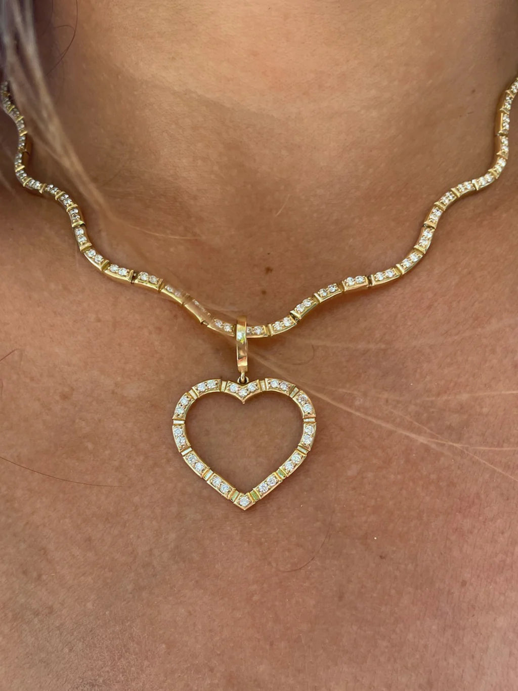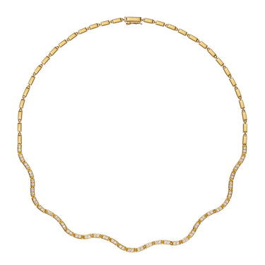 A modern classic with a fluid silhouette. The Glimmer Wave Diamond Necklace is handcrafted in 18k yellow gold and features a captivating wave design adorned with 1.10 carats of brilliant diamonds. Its sleek 16-inch length sits gracefully along the collarbone, making it a timeless statement piece that transitions effortlessly from day to evening.