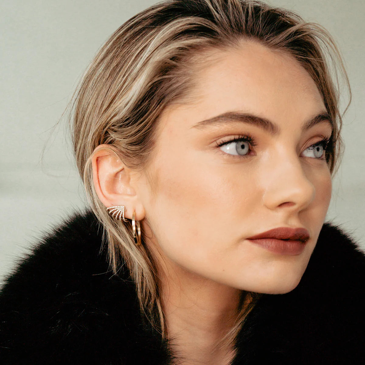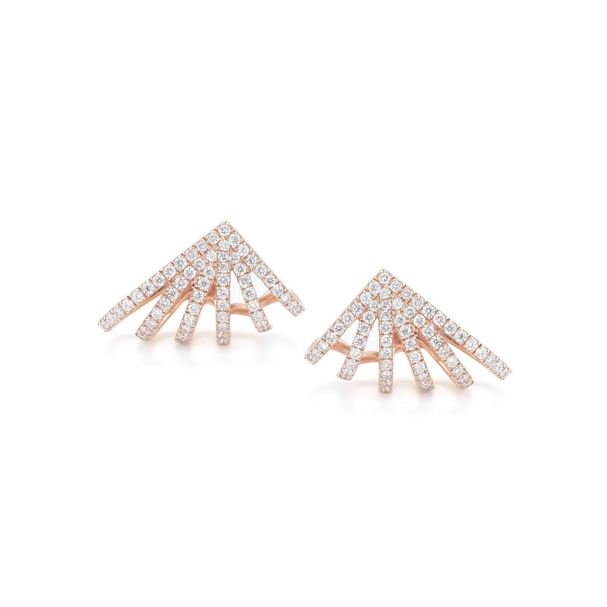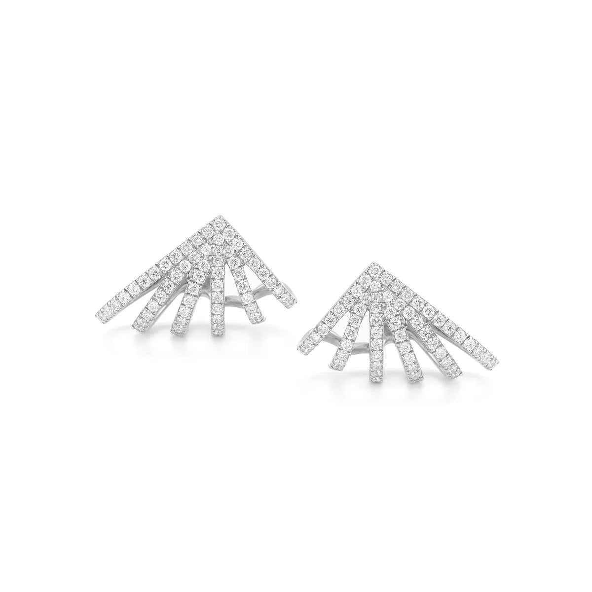 We are starry-eyed over these diamond huggie earrings! The Sarah Leah six burst diamond huggies are one of DRD's most popular styles. Six delicate pavé set diamond threads wrap around your earlobe for a chic and decadent statement. Bursting with almost a full carat of diamonds, these earrings are in show-stopper territory. While you might think these earrings are the perfect special occasion piece (they are) - we also love them with a simple t-shirt, jeans, and leather jacket. Secured with a hinge lever back clasp, these huggies are as comfortable as they are striking. Bring the glamour into your every day with the Dana Rebecca Designs Sarah Leah Six Burst Huggies.