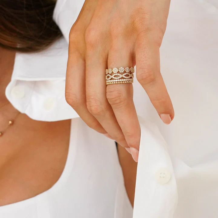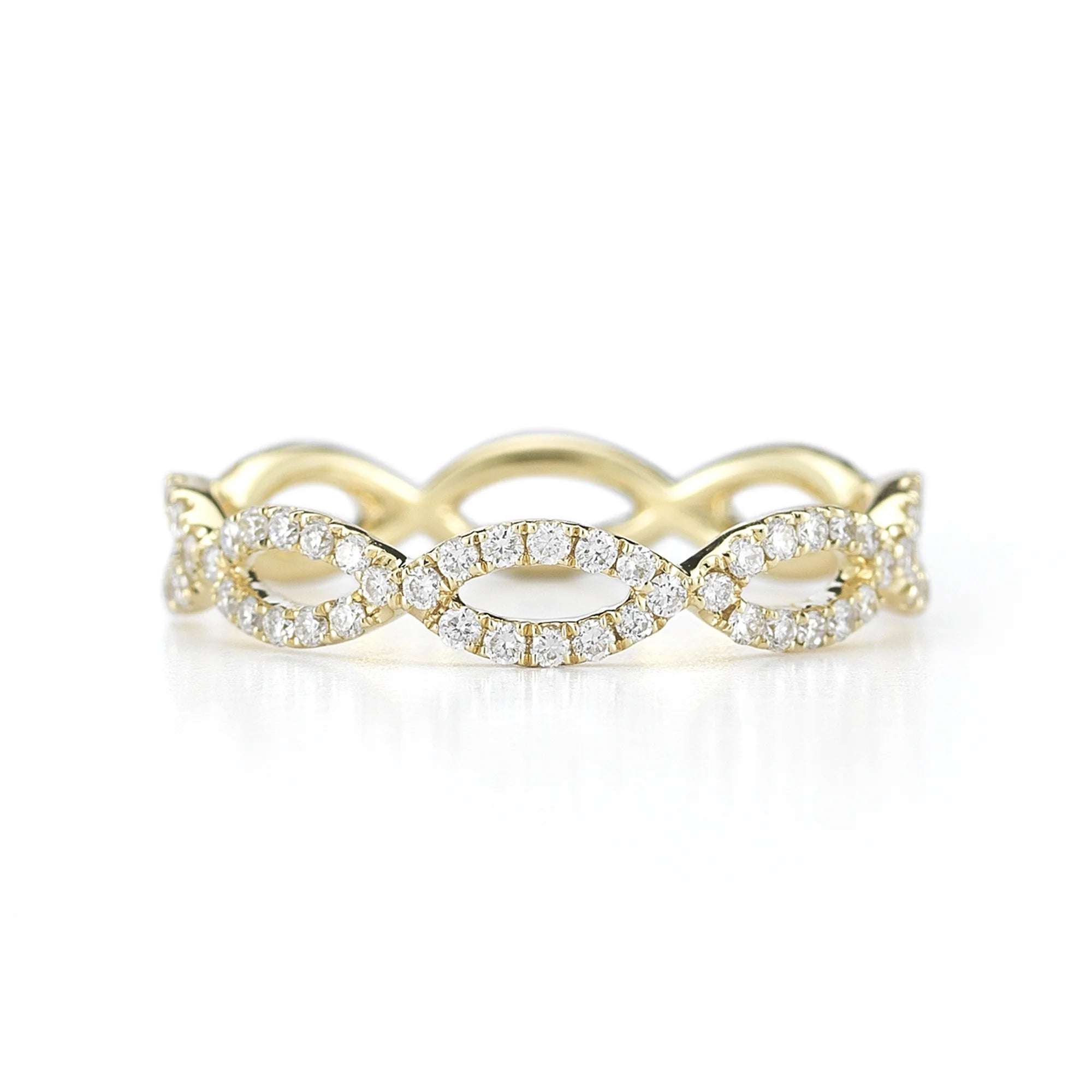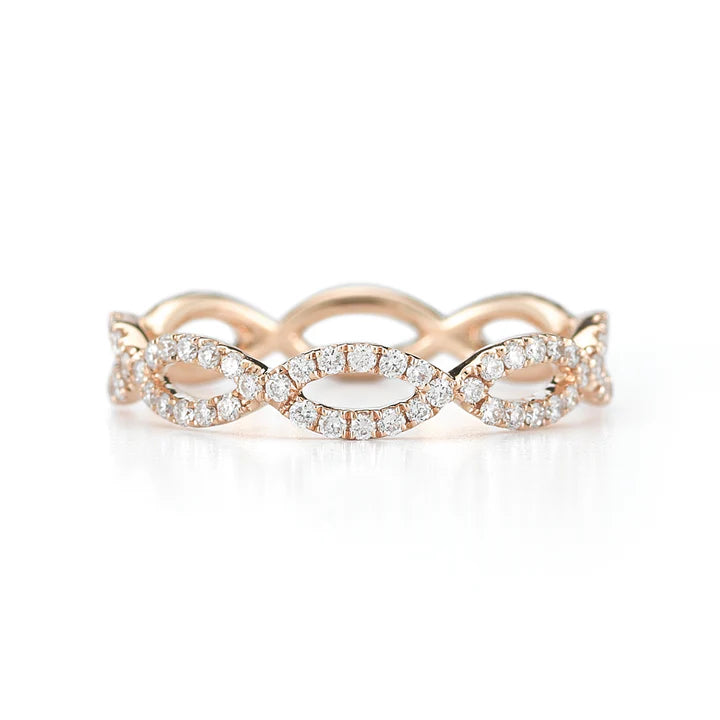 Two delicate rows of white round diamonds set in 14k gold intertwine to create this timeless and symbolic eternity ring. The Sophia Ryan Infinity ring has been one of Dana Rebecca Designs' most popular styles since it launched. The infinity symbol represents eternal love which is why this delicate diamond eternity ring design is so often used as an anniversary band, women's wedding band, or to commemorate a personal achievement. Dana herself often pairs her Sophia Ryan Infinity band with her bridal stack when she isn't rocking it as part of her righthand stack.