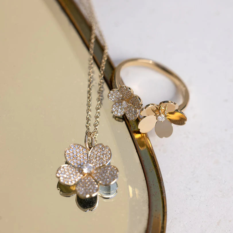 The Diamond and Gold Double Cherry Blossom Ring combines the beauty of gold and sweet diamond sparkle in one floral ring arrangement. Designed with dimensional petals and round diamond centers, both cherry blossoms sit shimmering side by side. After all, you deserve fresh flowers every day.