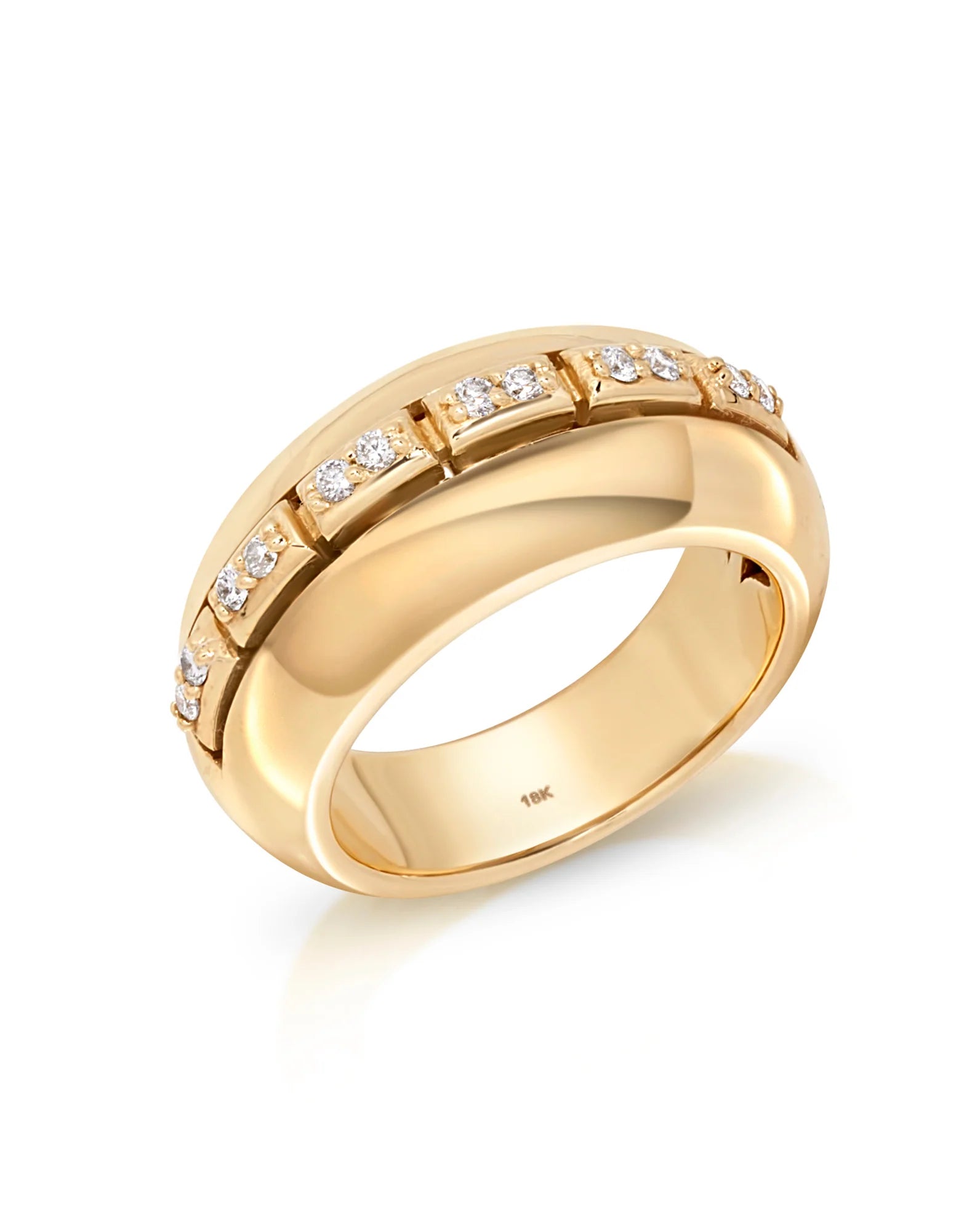 Sleek, sculptural, and luminous — the Glimmer Dome Ring by Onirikka is the ultimate expression of modern sophistication. Handcrafted in 18k yellow gold, this chunky band features a single line of pavé diamonds totaling 0.18 carats, adding a subtle shimmer that catches the light from every angle.