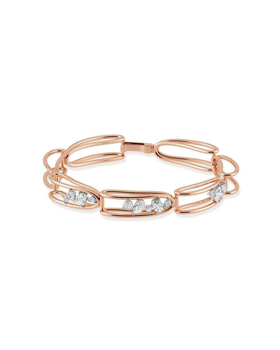 Our Mara Folded Links Bracelet is made in 18K gold with varying sized round, pear and oval shaped natural diamonds set in platinum. Featuring three asymmetrical diamond filled links.