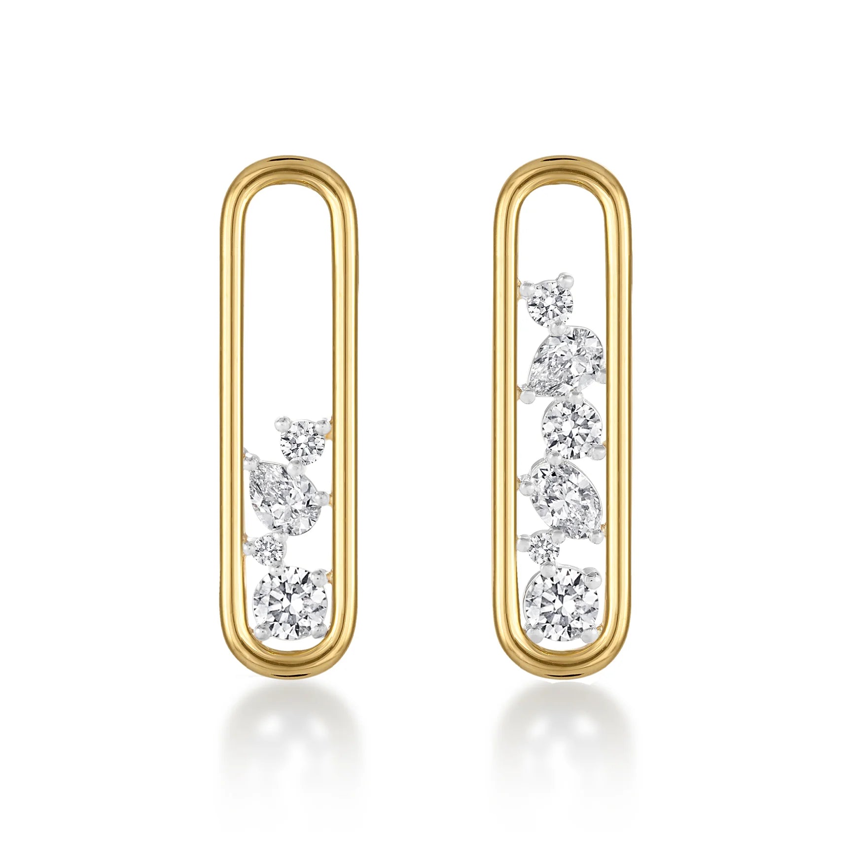 Not your average diamond earrings! Filled with sparkle for a statement look. It is meticulously handcrafted in 18K solid gold with varying sized pear shaped and round brilliant natural diamonds set in platinum.