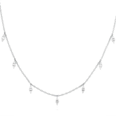 The Diamond Mia Necklace dazzles with timeless versatility. Featuring nine diamond drops—each with baguette and prong-set round stones—resting along our Every Length Chain. Complete with an adjustable golden slider that glides effortlessly along the chain, this piece lets you choose your ideal length, making it perfect for endless layering possibilities.