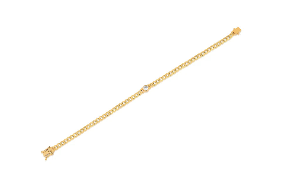 The Diamond Sari Bracelet is a sparkly version of our classic Curb Chain. Featuring tightly twisted 14k gold flat chain links adorned with a single bezel-set diamond in the middle, this bracelet adds just the right amount of sparkle.