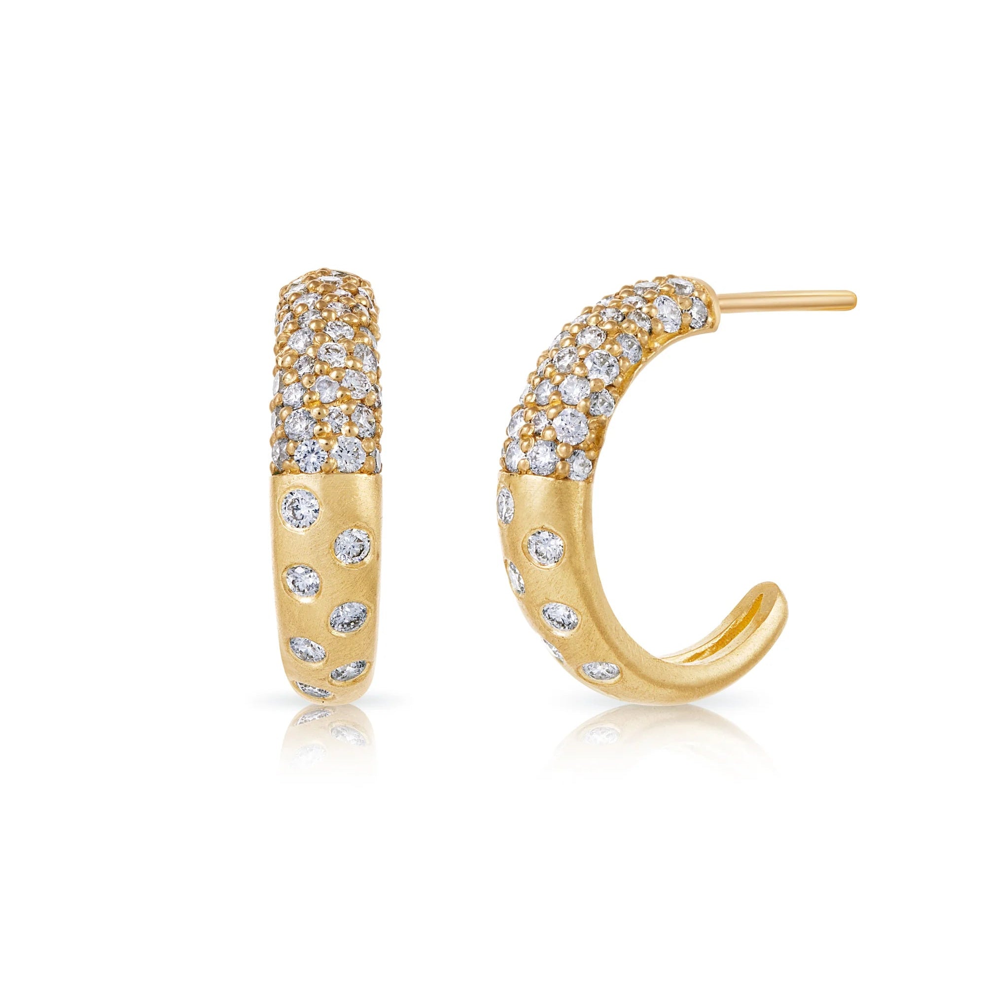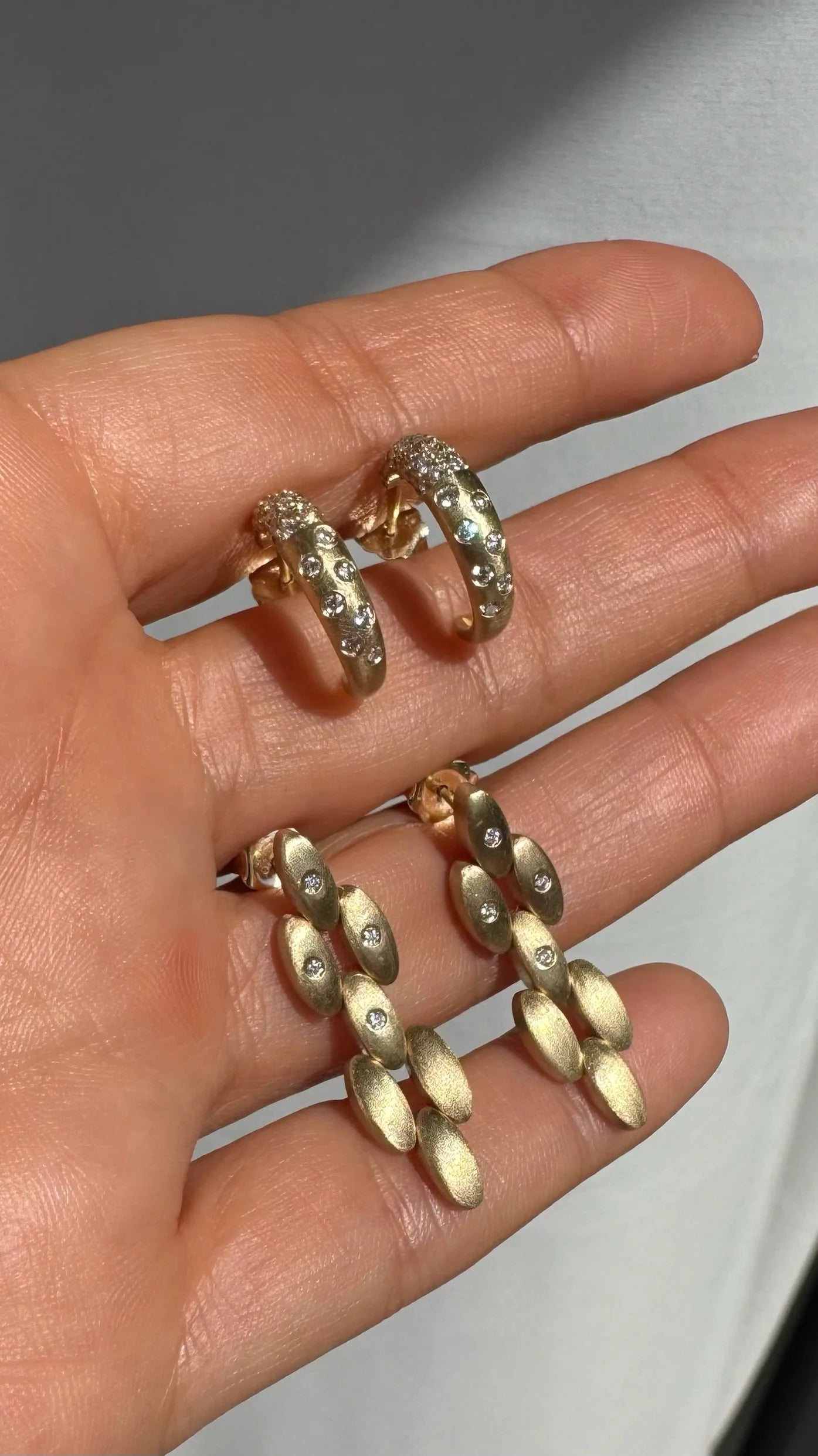 The Synergy Hoop by Onirikka captures harmony in contrast — where modern minimalism meets timeless radiance. Handcrafted in 14k satin yellow gold, each curve is set with 0.49 carats of diamonds, creating a luxurious balance of texture, form, and light.