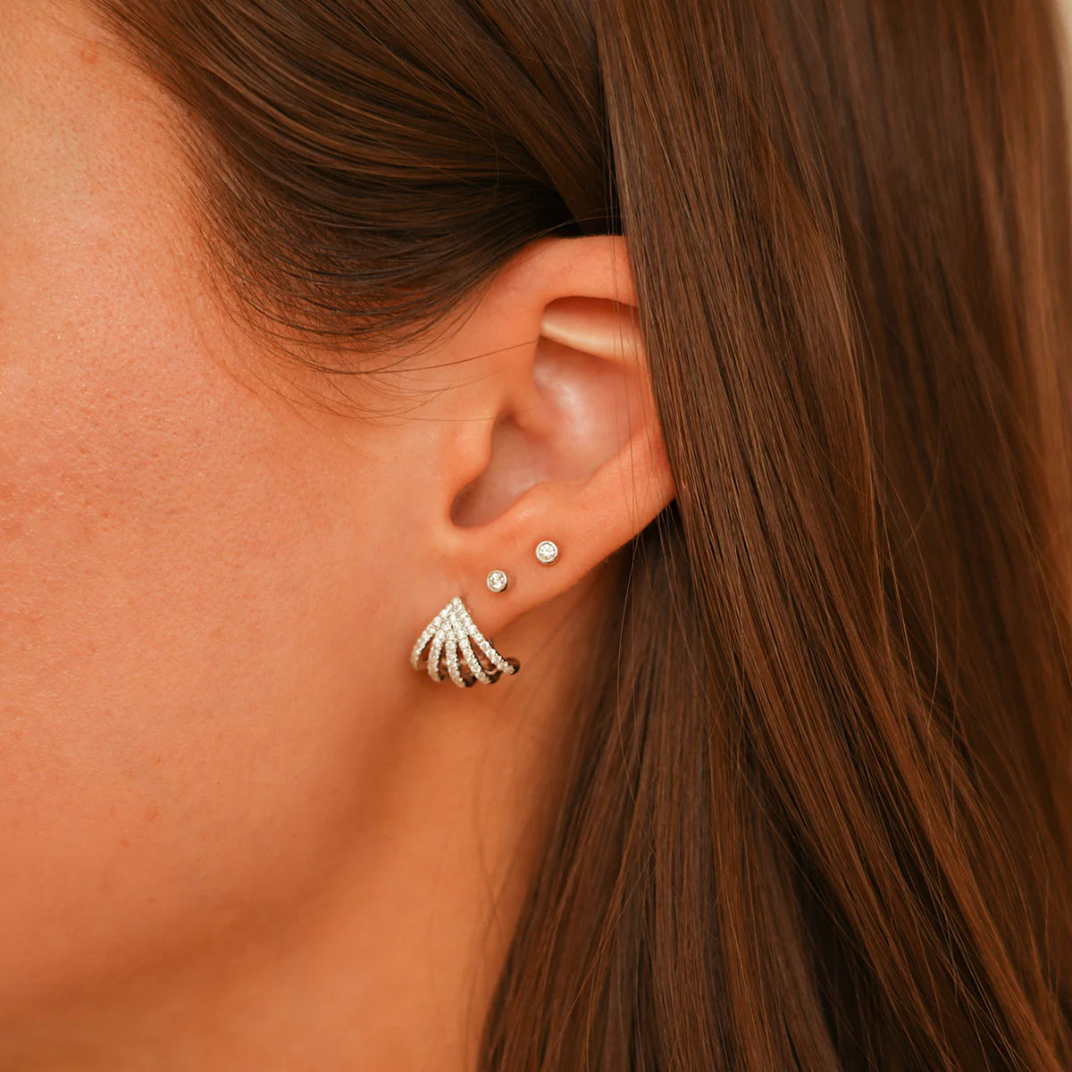Behold, the gold and diamond huggie earrings of your dreams! Our Sarah Leah Five Burst diamond huggies are one of Dana Rebecca Designs most popular styles. Five delicate pavé set diamond threads wrap around your earlobe for a chic and decadent statement. Bursting with over a half-carat of diamonds, these huggie earrings are definitely in show-stopper territory. While you might think these diamond huggies are the perfect special occasion piece (they are) - we actually also love them with a simple t-shirt, jeans, and leather jacket. Secured with a hinge lever back clasp, these diamond huggie earrings are as comfortable as they are striking. Bring the glamour into your every day with the Dana Rebecca Designs Sarah Leah Five Burst Huggies.